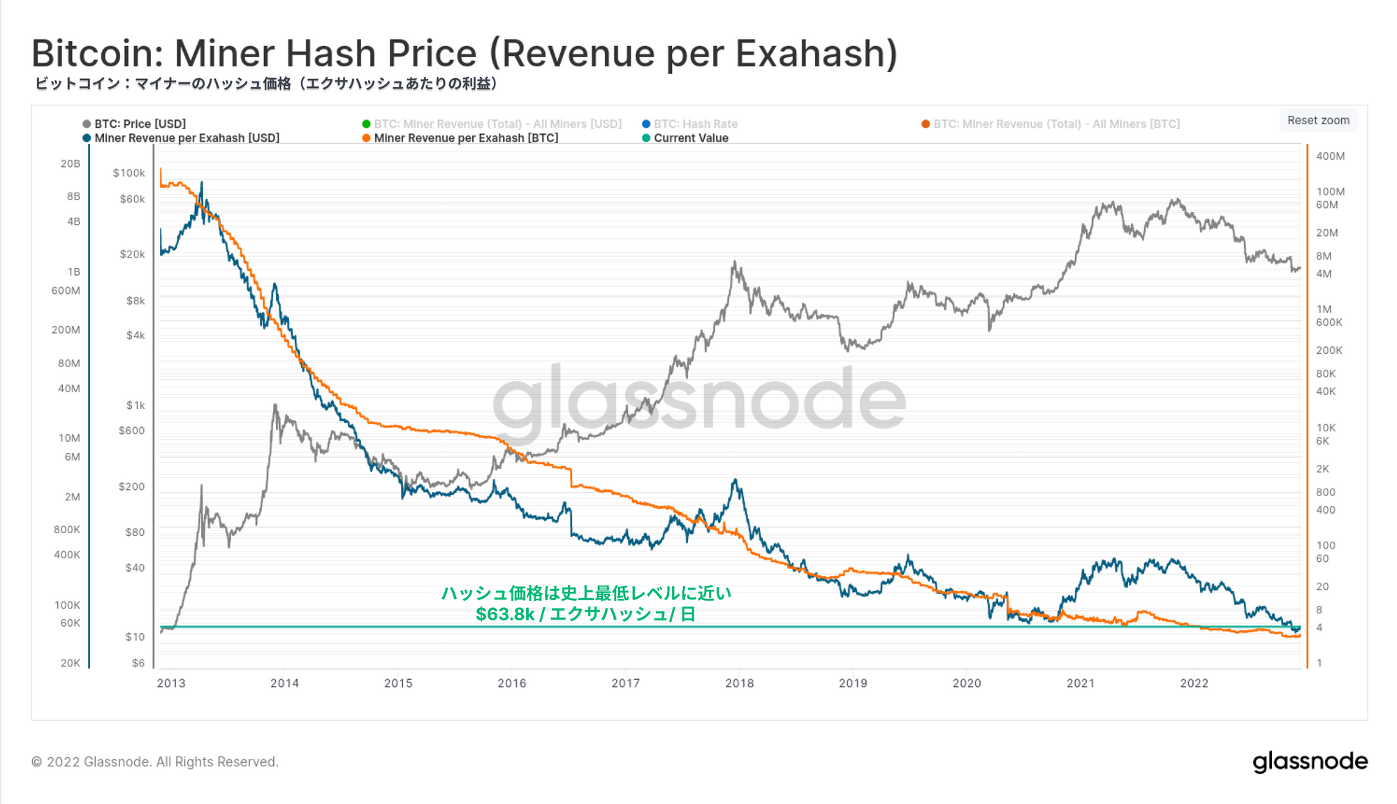 しかし、ハッシュ価格が過去最低をかろうじて上回っているというレベルを考えると、これはあまり驚きではない。現在はスポット価格(~$17k)が2020年10月(~$10k)よりも70%高いにもかかわらず、次のビットコインブロックを探し当てるために競争しているハッシュパワーの量は70%高い。