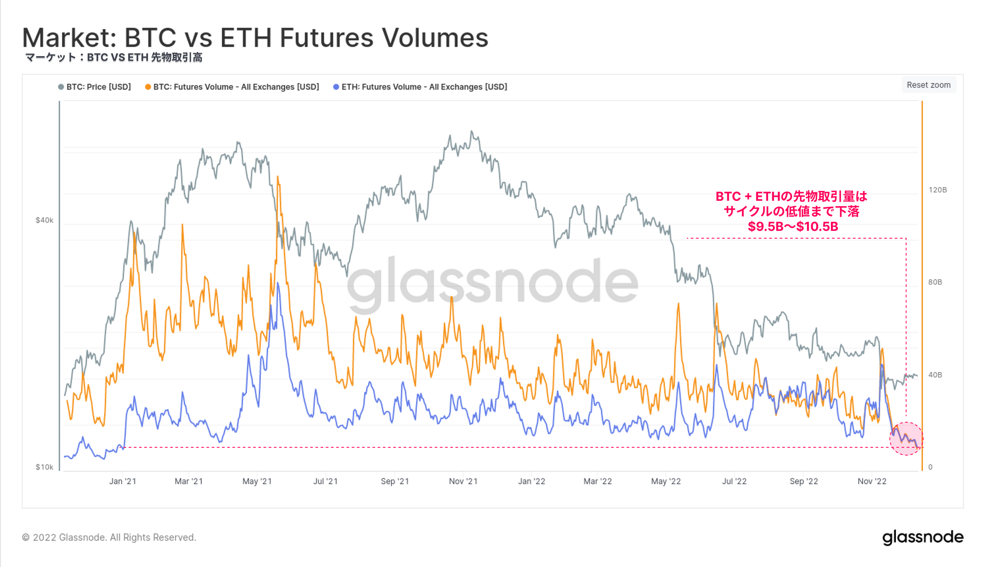先物の出来高も同様に減少しており、現在は数年来の低水準に近づいている。現在、BTCとETHの両市場は1日あたり95億ドルから105億ドルの間という同等の取引量となっている。これは、流動性の引き締め、広範なデレバレッジ、そしてこの業界における多くの融資およびトレーディングデスクの減損がもたらした大きな影響を示している。