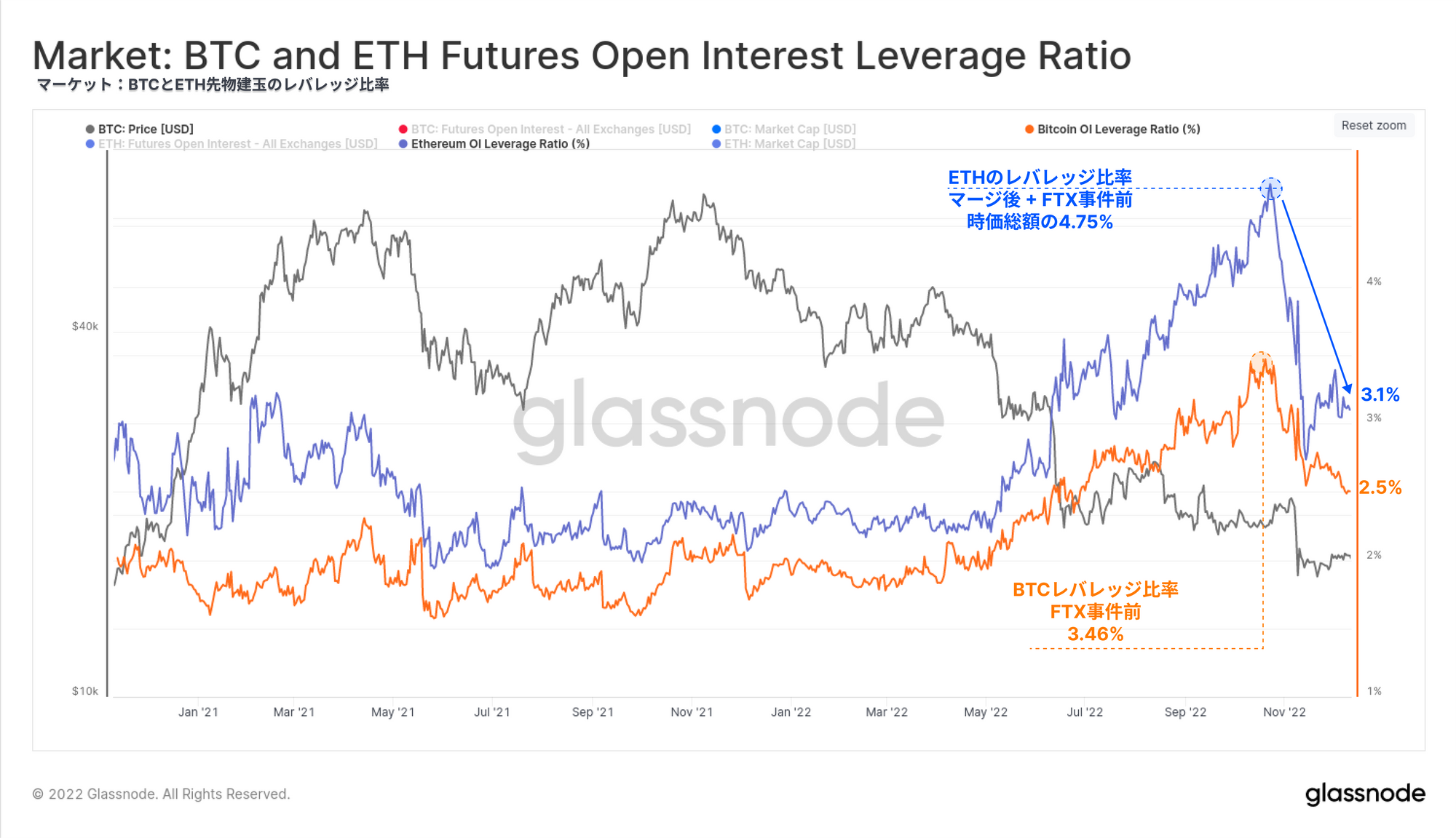 11月の先物レバレッジの上昇と解消においては、ETHの方が著しく厳しく、おそらく残存する「マージ取引」が決済された結果だと思われる。ETHの建玉は、時価総額の4.75%から3.10%まで減少している。BTCのレバレッジ比率はETH市場より1週間前にピークを迎え、その後、先月に時価総額の3.46%から2.50%まで減少している。