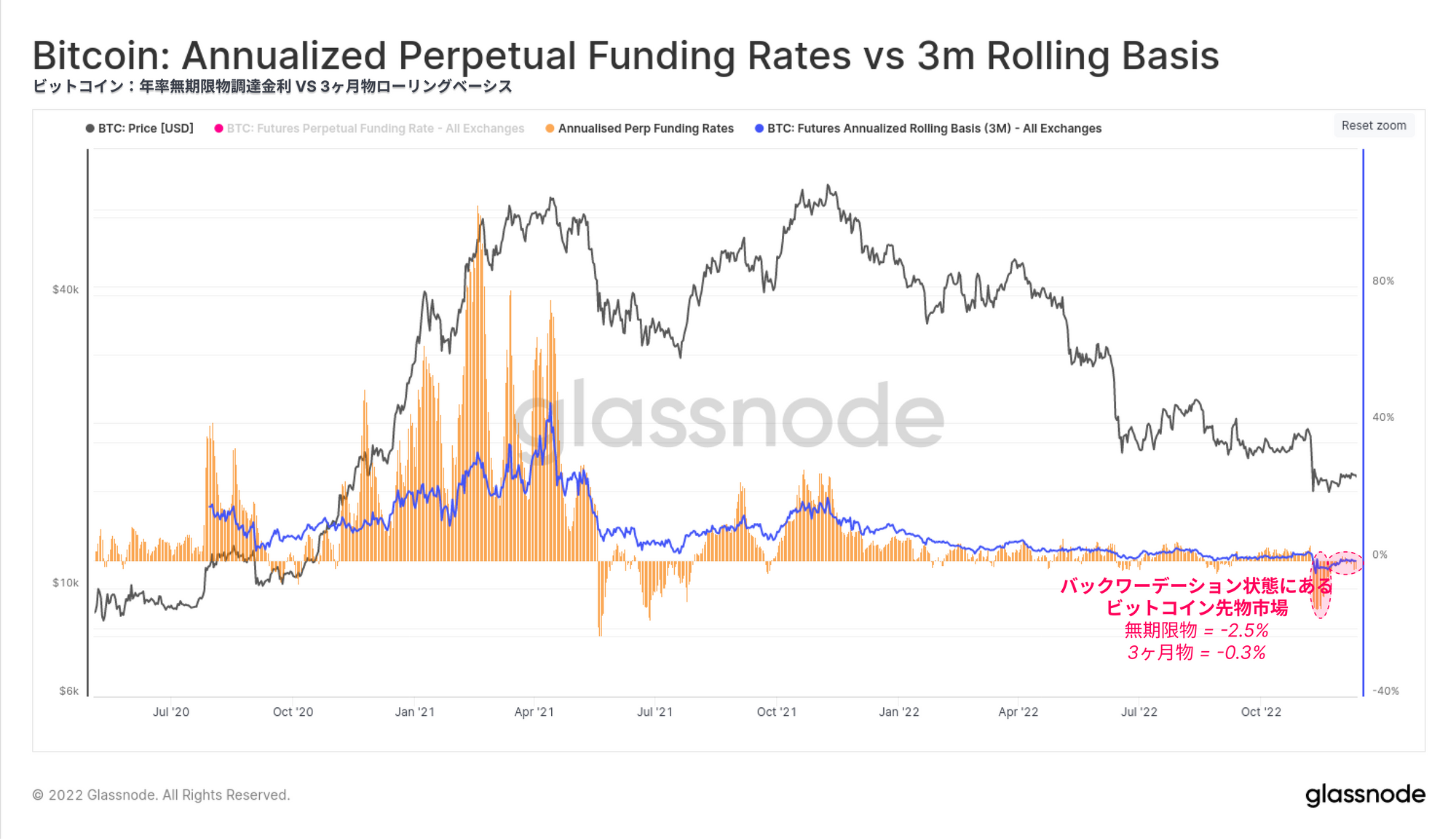 ビットコインカレンダー先物と無期限先物は共にバックワーディションの状態で取引されており、年率換算でそれぞれ-0.3%、-2.5%となっている。バックワーディションの期間が持続的であることは珍しく、同様の期間は2021年5月から7月の間だけである。このことは、市場がさらなる下降リスクに対して相対的に「ヘッジ」していること、および/または、ショートの投機筋が多いことを示唆している。