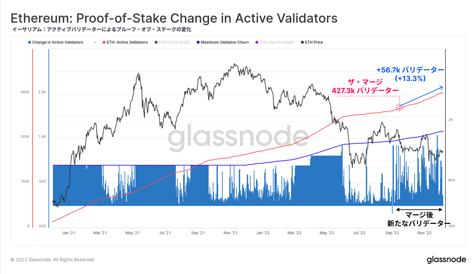 マージ以降、アクティブなバリデーター数は13.3%増加し、現在484k以上のバリデーターが稼動している。これにより、ステークされたETHは15.618M ETHとなり、これは流通供給量の12.89%に相当する。