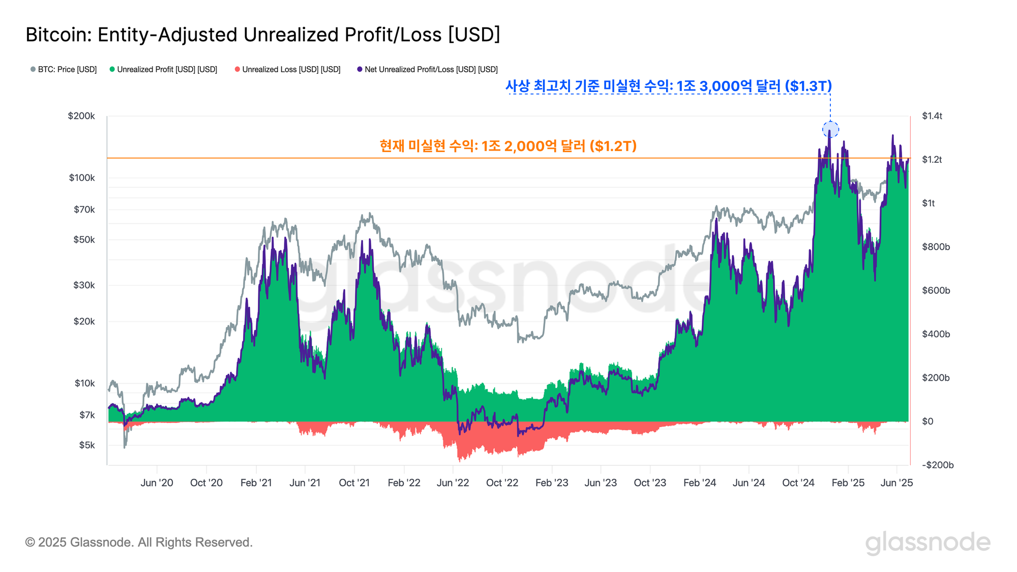 - 비트코인이 10.7만 달러까지 회복한 이후, 대다수의 비트코인 투자자들이 미실현 수익 상태에 있습니다. 전체 투자자들이 보유한 미실현 수익 규모는 약 1.2조 달러에 달합니다.
