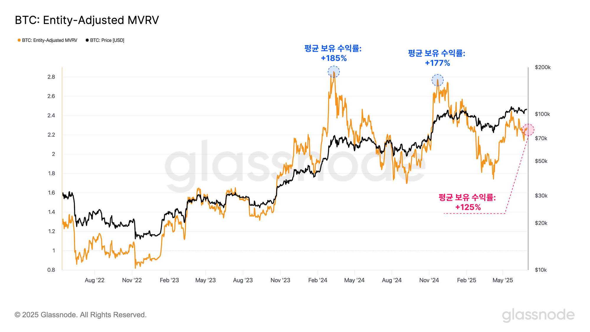 현재 기준으로, 투자자 1인당 평균 평가 수익률은 +125%에 달하며, 이는 비트코인 투자자들이 상당한 잠재 수익을 보유하고 있음을 시사합니다. 다만 이 수치는, 비트코인이 당시 최고가였던 7.3만 달러에 도달했던 2024년 3월의 +180%, 그리고 10만 달러를 처음 돌파했던 2024년 12월 당시와 비교하면 상대적으로 낮은 수준입니다.