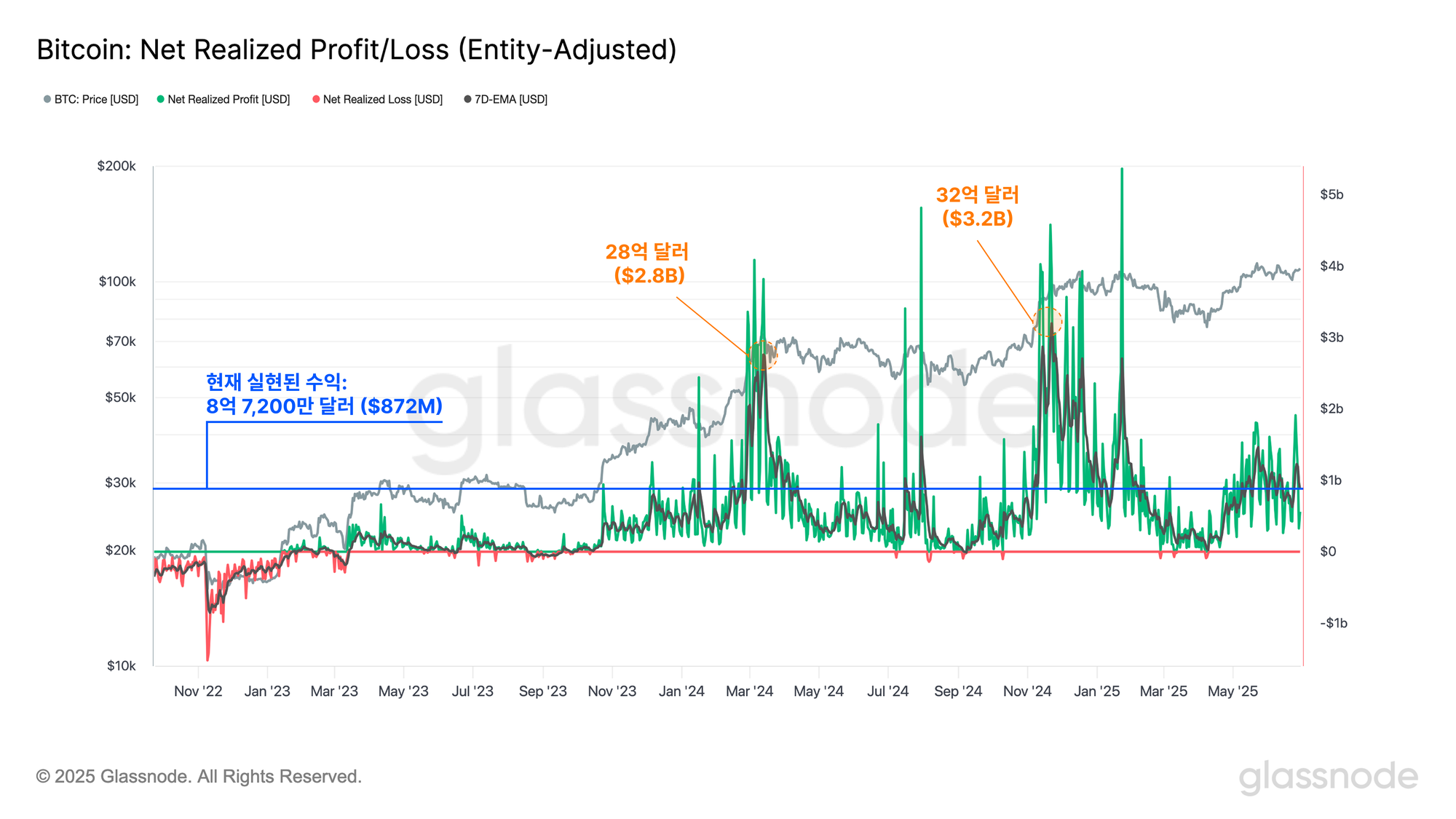 현재 하루 평균 약 8억 7,200만 달러 규모의 차익이 온체인에서 실현되고 있는데,이는 각각 7.3만 달러와 10.7만 달러의 사상 최고가 형성 당시 기록된 28억 달러, 32억 달러 규모의 차익 실현과 비교하면 현저히 낮은 수준입니다.