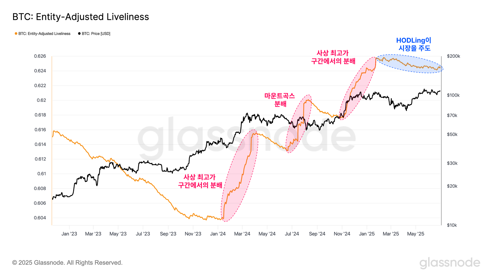 - Liveliness가 하락세일 경우, 투자자들이 코인을 그대로 보유하며 이동시키지 않고 있음을 의미하며,이는 HODLing이 시장의 중심 행태임을 시사합니다.