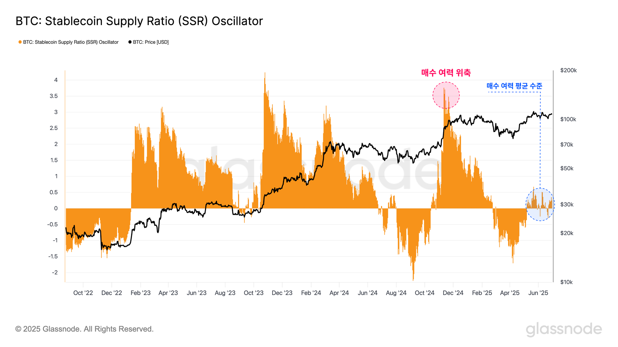 스테이블코인의 구매력을 정량적으로 평가하기 위해,Stablecoin Supply Ratio Oscillator (SSR) 지표를 사용할 수 있습니다. 이 지표는 비트코인 공급량 대비 스테이블코인 공급량(비트코인 기준 환산) 의 비율을 측정하며, BTC와 USD 유동성 간 상대적인 수요 압력을 파악하는 데 활용됩니다.