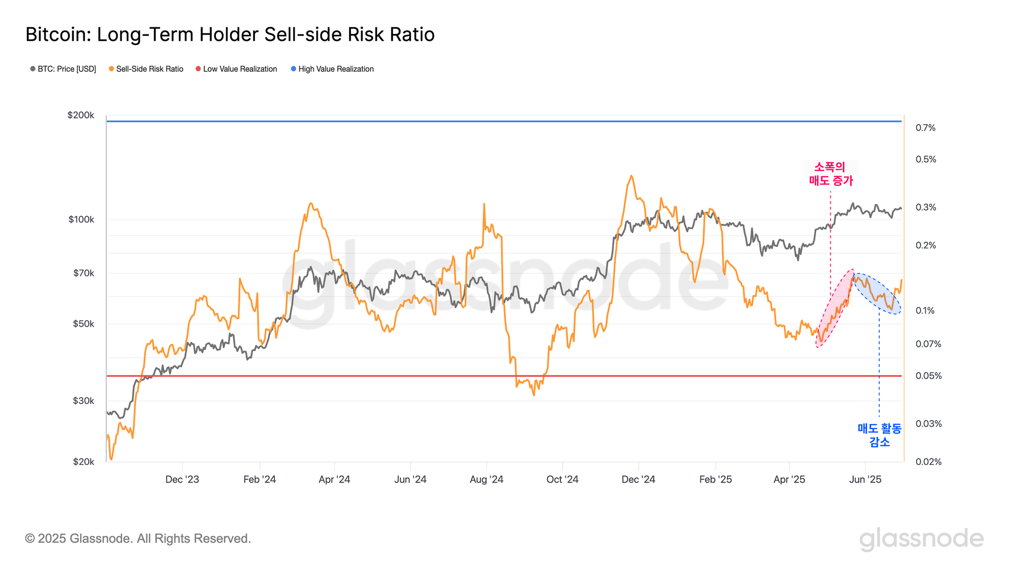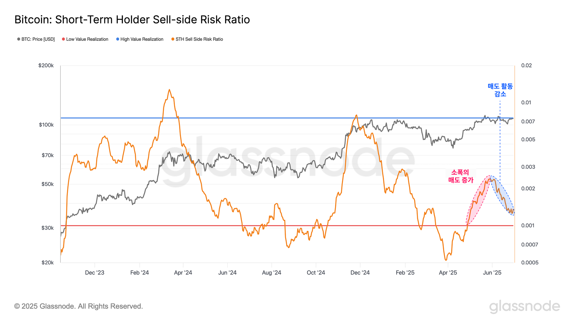 Sell-Side Risk Ratio(차익 실현 민감도 지표)는 투자자들이 실현하는 손익의 규모를 기준으로, 현재 시장의 매도 흐름과 안정성(균형 상태)을 평가할 수 있는 유용한 지표입니다.
