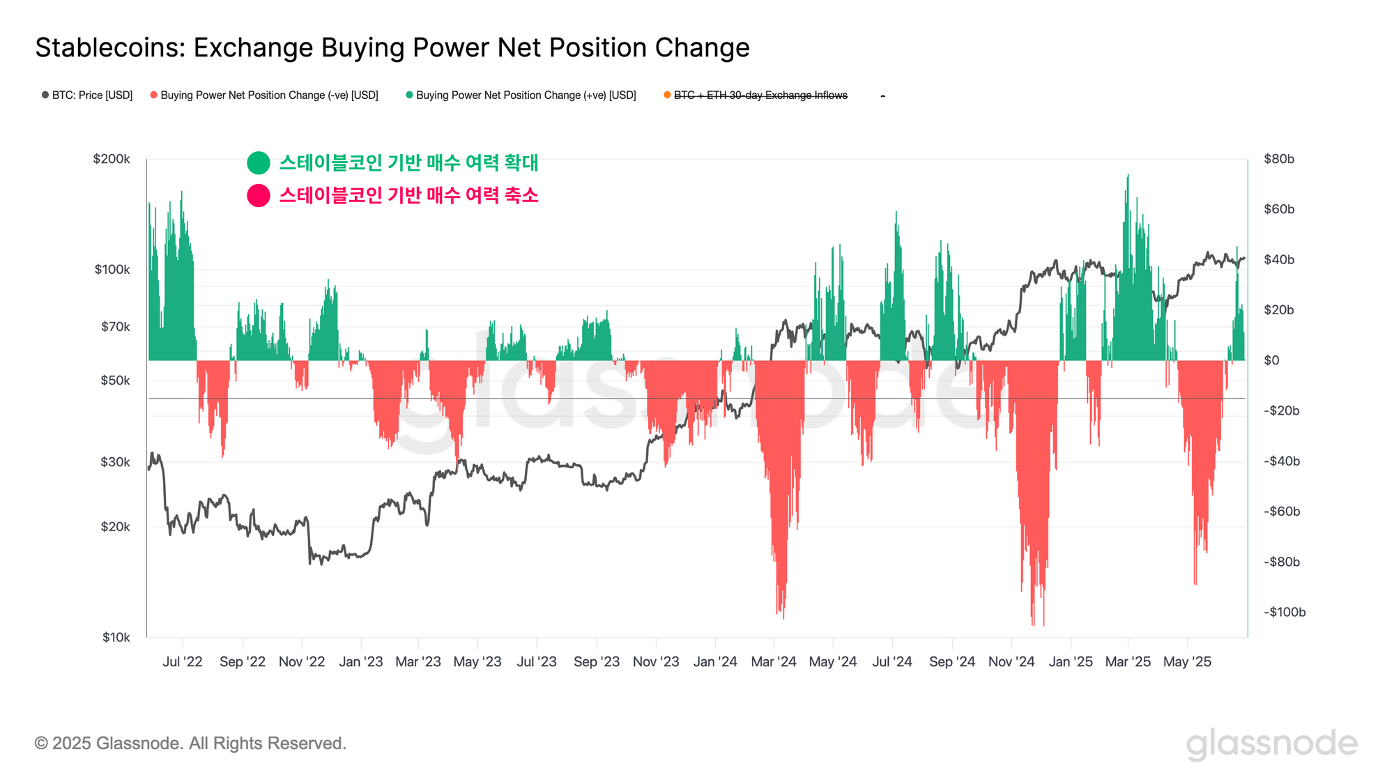 Exchange Buying Power는 스테이블코인 매수 여력을 상대적으로 파악할 수 있는 또 다른 지표입니다. 이 지표는 거래소 내 주요 스테이블코인의 30일 공급 변화량에서,같은 기간 동안 BTC 및 ETH의 USD 기준 순유입 변화량을 뺀 값으로 계산됩니다. 이 지표는 다음과 같은 틀에서 해석할 수 있습니다:
