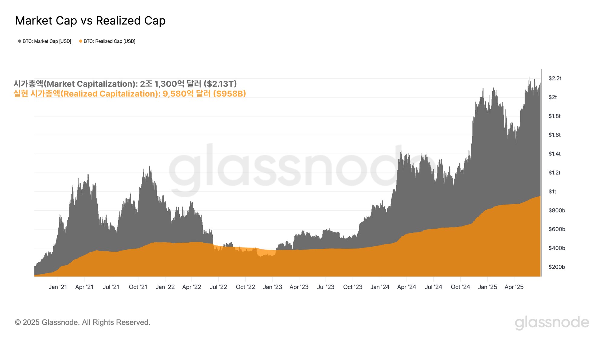 - 실현 시가총액(Realized Cap): 9,580억 달러