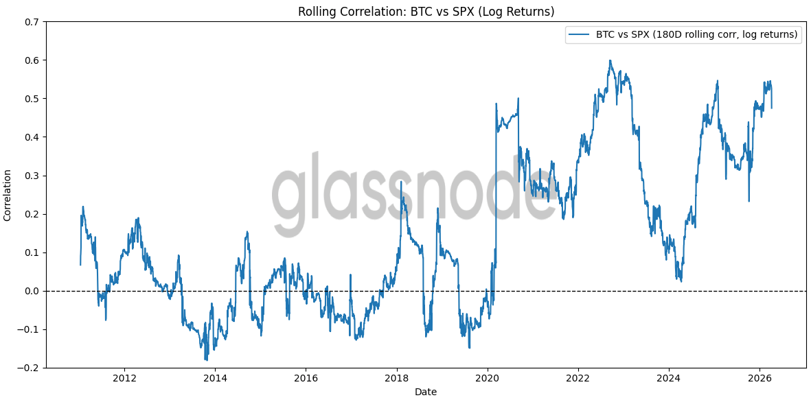 The chart above plots the 180-day rolling correlation between Bitcoin and the S&P 500 using log returns. The main signal is that BTC appears to have become more sensitive to macro and broader risk-asset dynamics over time. In earlier years, the correlation hovered around zero or was occasionally negative, while in recent years it has often been meaningfully positive.