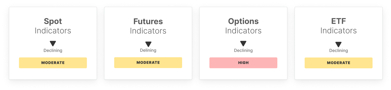 The options market remains active, though sentiment has cooled slightly. Open interest dipped, and 25-delta skew rose but remains negative—still showing call-side bias, albeit with less conviction. Volatility spread remains above the high band, confirming continued speculation on price swings despite fading momentum.
