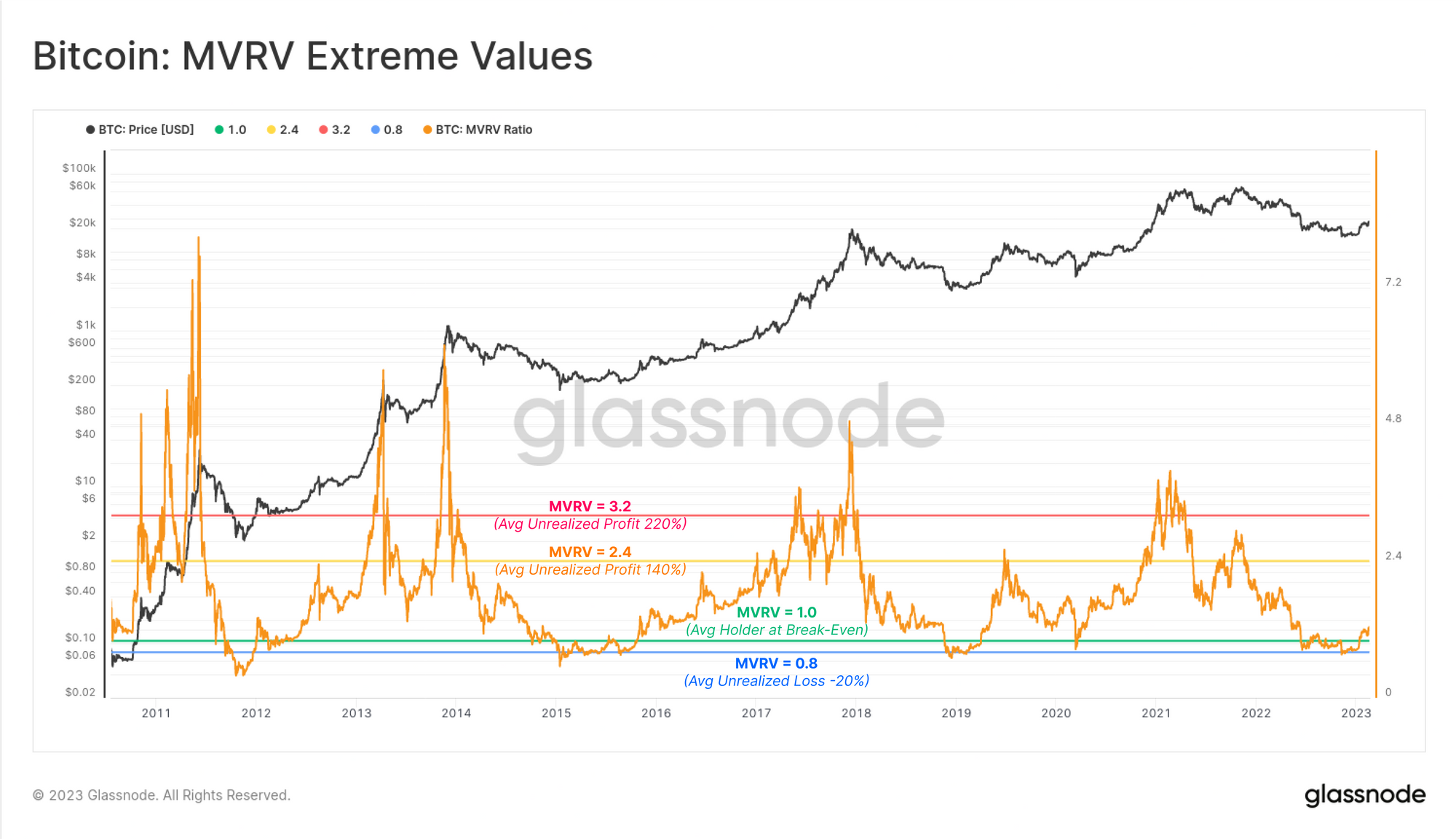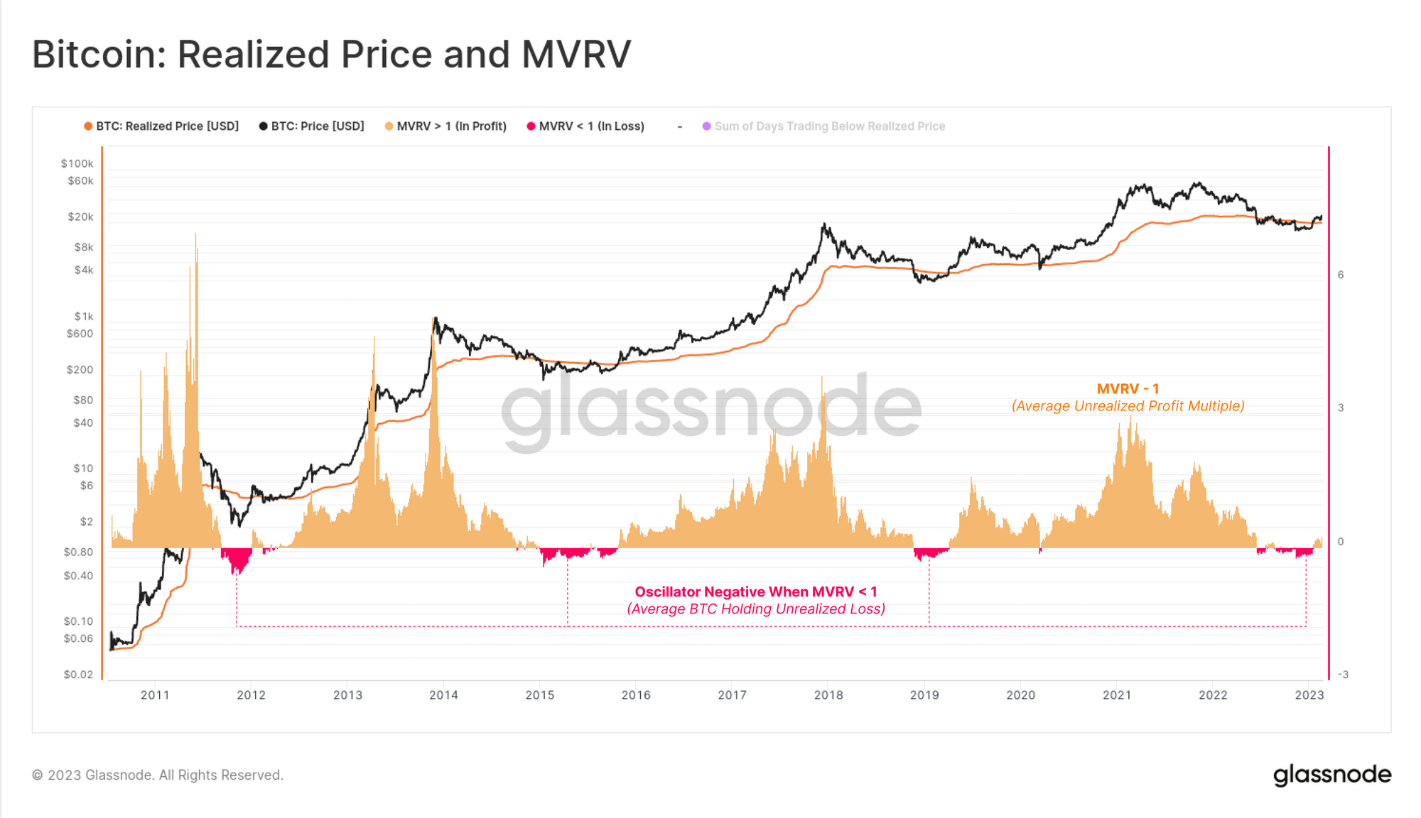 - A MVRV of 0.8 means Price is 0.8x the Realized Price (-20% Loss)