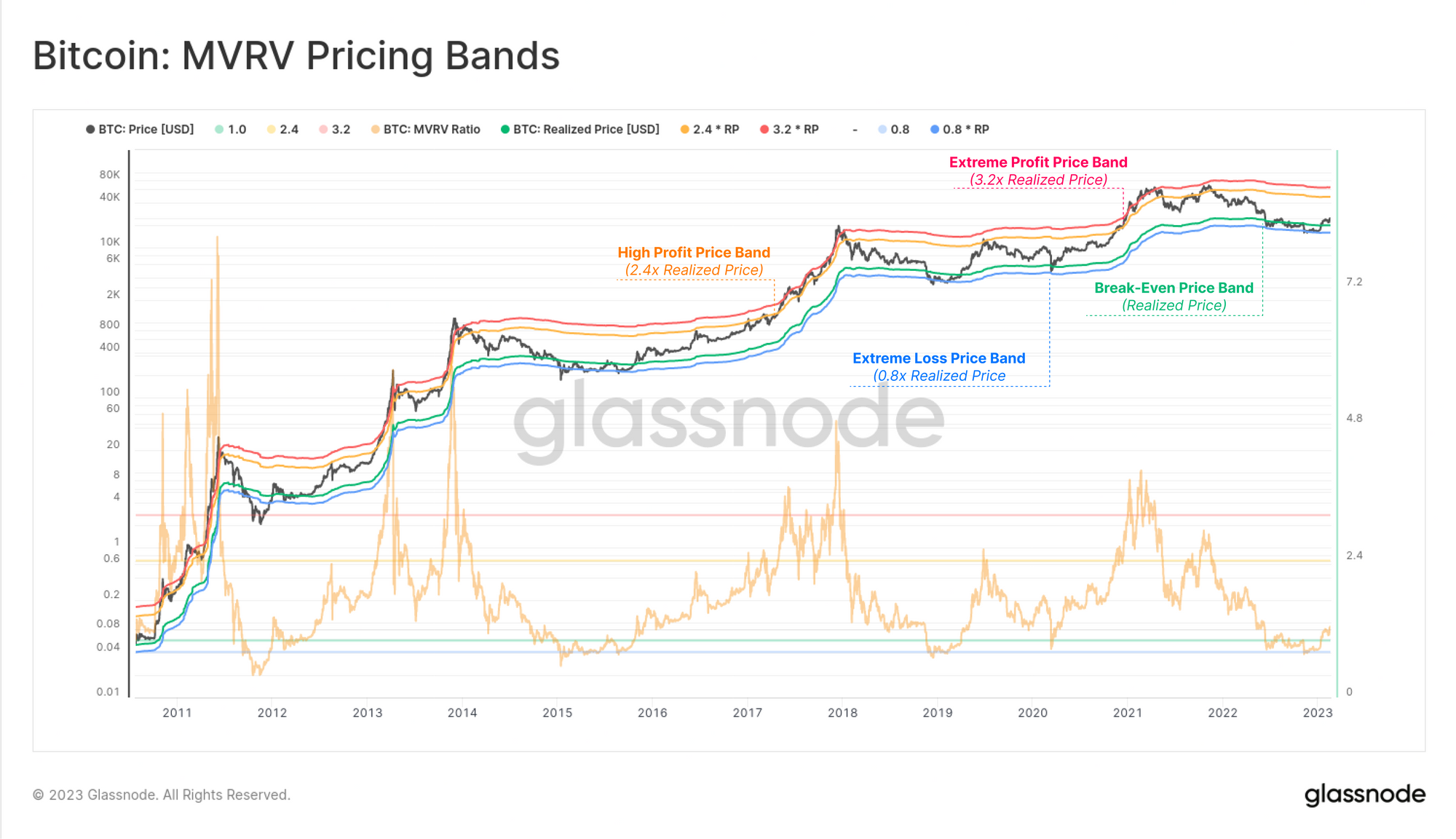 Now that we have defined a set of 'extreme levels' for MVRV, we can visualize these as pricing bands. If the MVRV Ratio equals 2.4, that means the corresponding pricing band is 2.4x the Realized Price.
