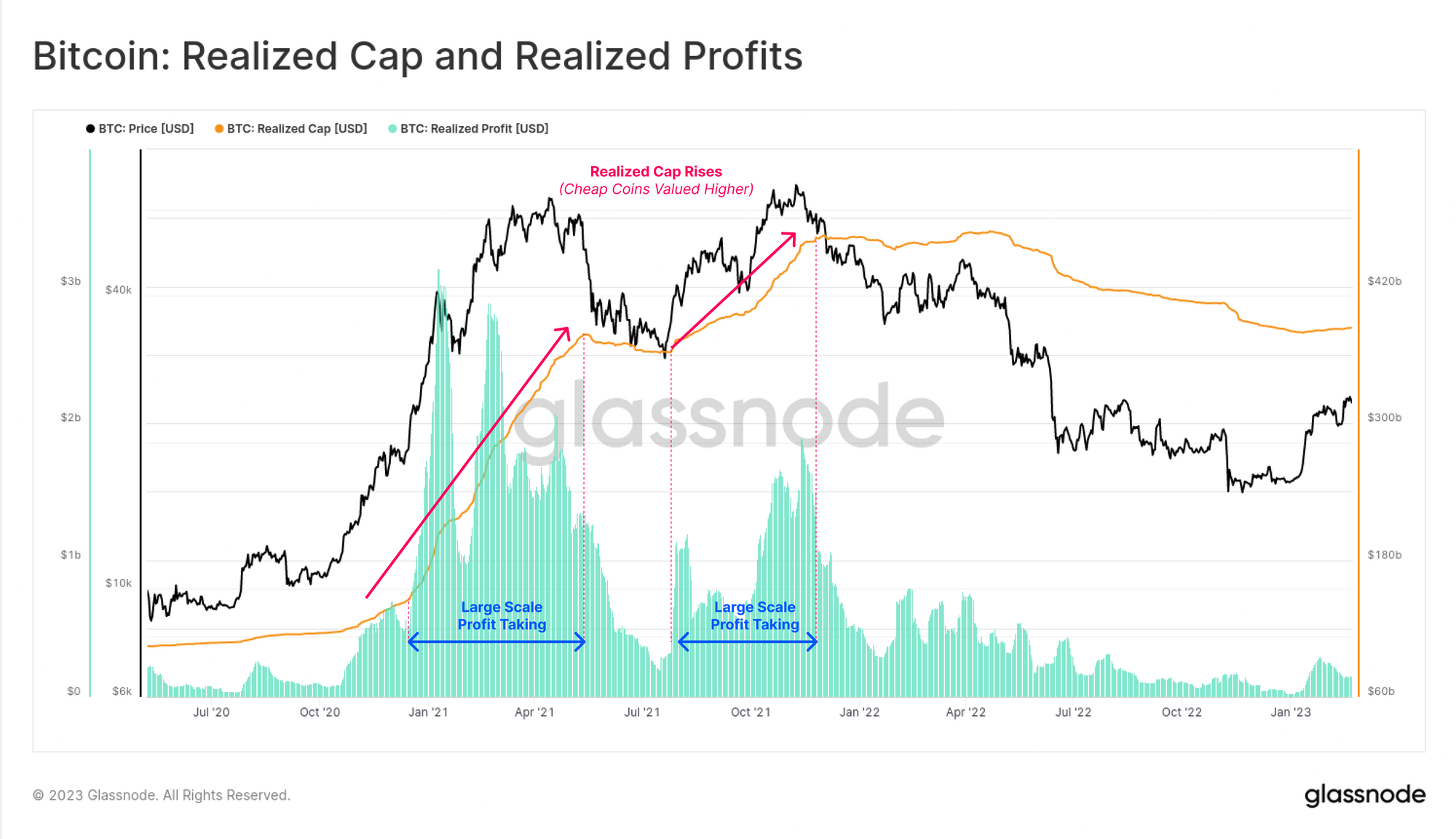 We can see that the 2022 bear market created a downtrend in the Realized Cap, as losses were locked in, and the metric returned to July levels. This represented a flushing out of all the speculative premium added between July and Nov 2021.