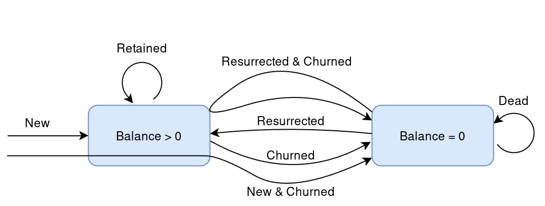 Figure 2. illustrates the possible transitions. For example, an address that held an asset in the previous 30-day window and continues to do so is classified as retained. In contrast, addresses that previously held the asset but have since reduced their balance to zero are classified as churned.