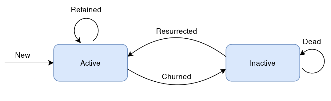 At any given point in time, we track the number of active and inactive addresses and analyze their transitions between these states. Figure 1. illustrates the possible transitions, categorizing addresses into four key cohorts: