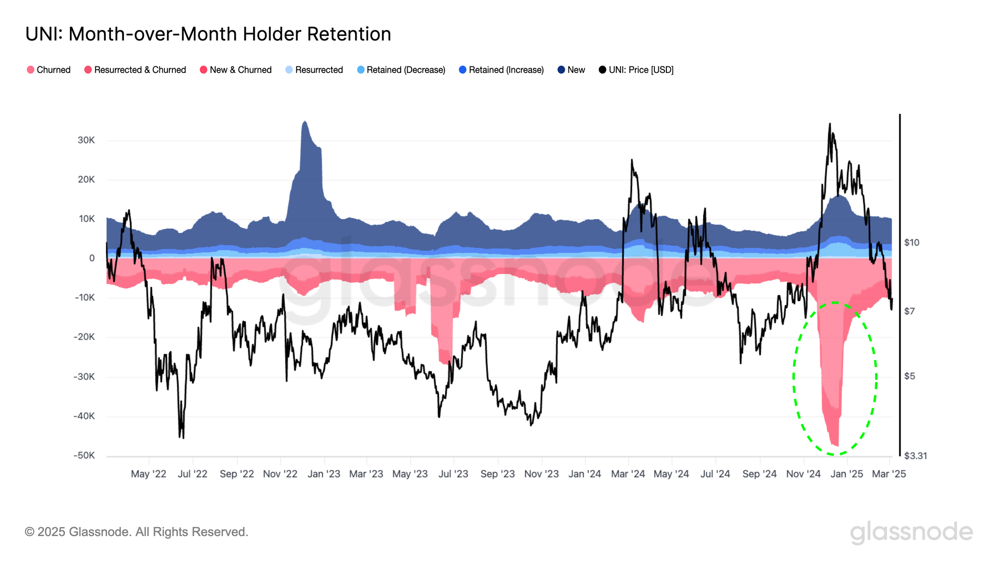 Figure 4 illustrates how price movements can impact Holder Retention. While market conditions naturally influence retention trends, this example highlights a distinct pattern, when a significant number of UNI holders churned amid the sharp price increase in late 2024, potentially indicating investors exiting positions.