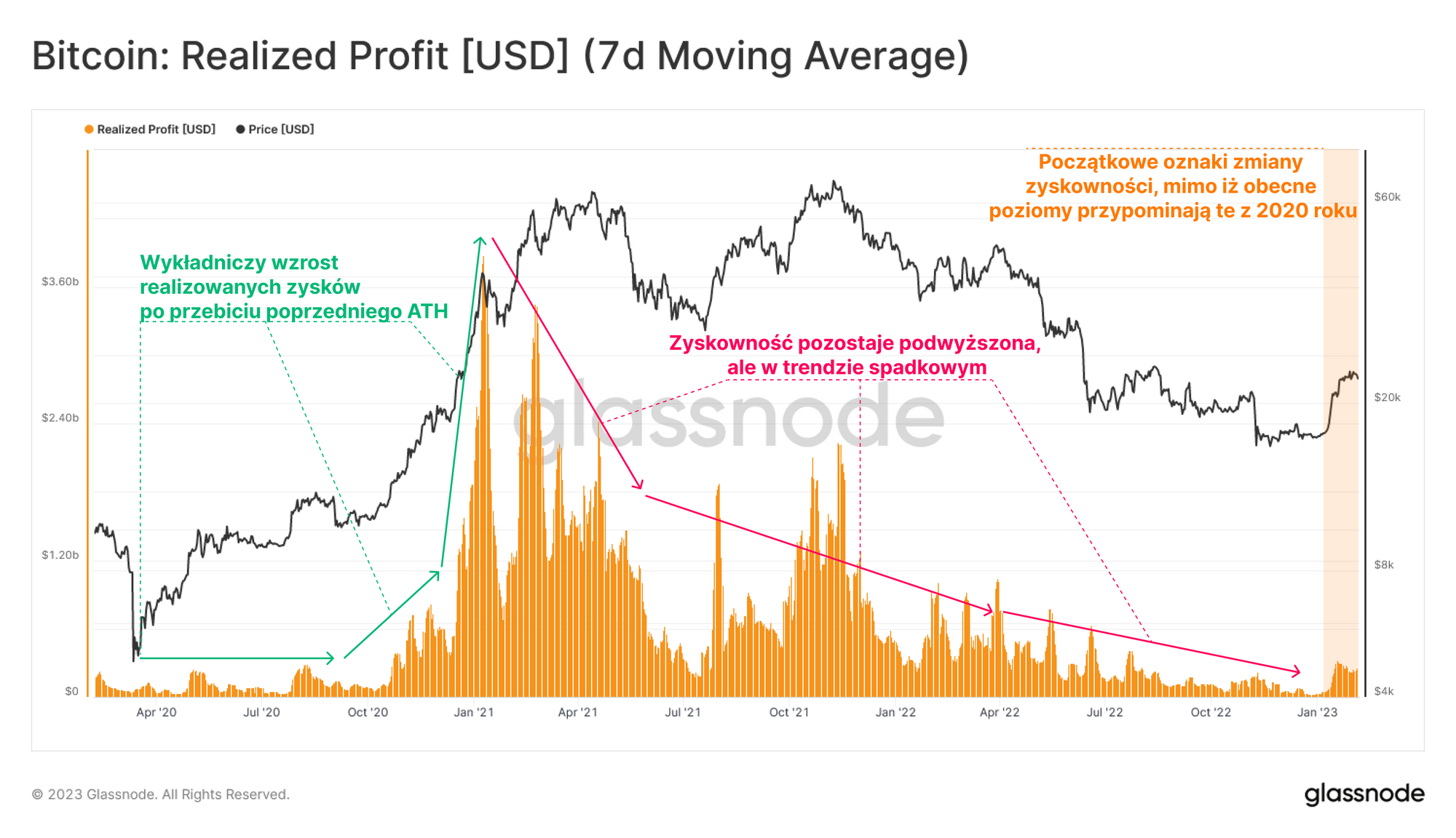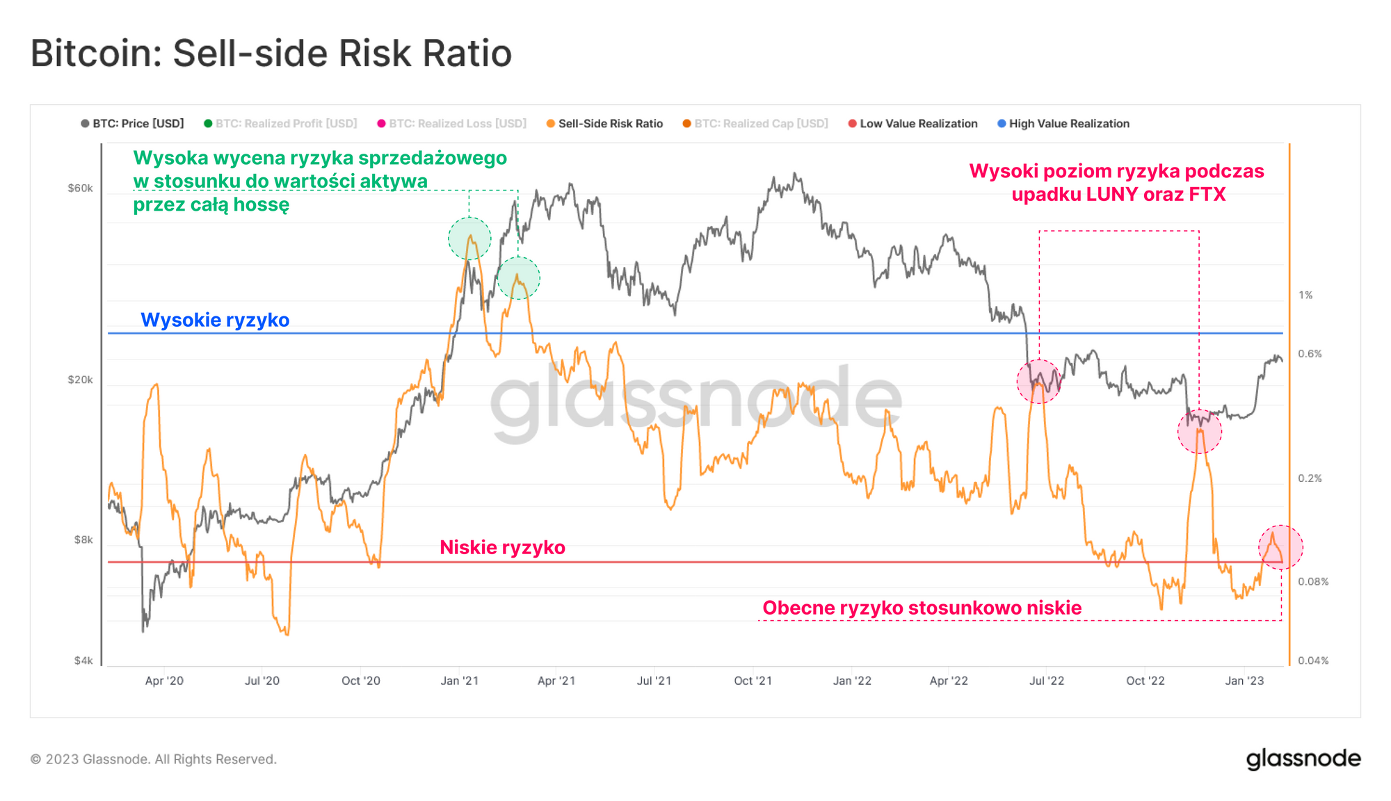 Można jednak zauważyć, że obecny poziom realizowanych strat spadł ku bazowemu poziomowi cyklu wynoszącemu około 200 mln USD dziennie, z wyjątkiem przypadków wyraźnej kapitulacji (np. LUNA / FTX).