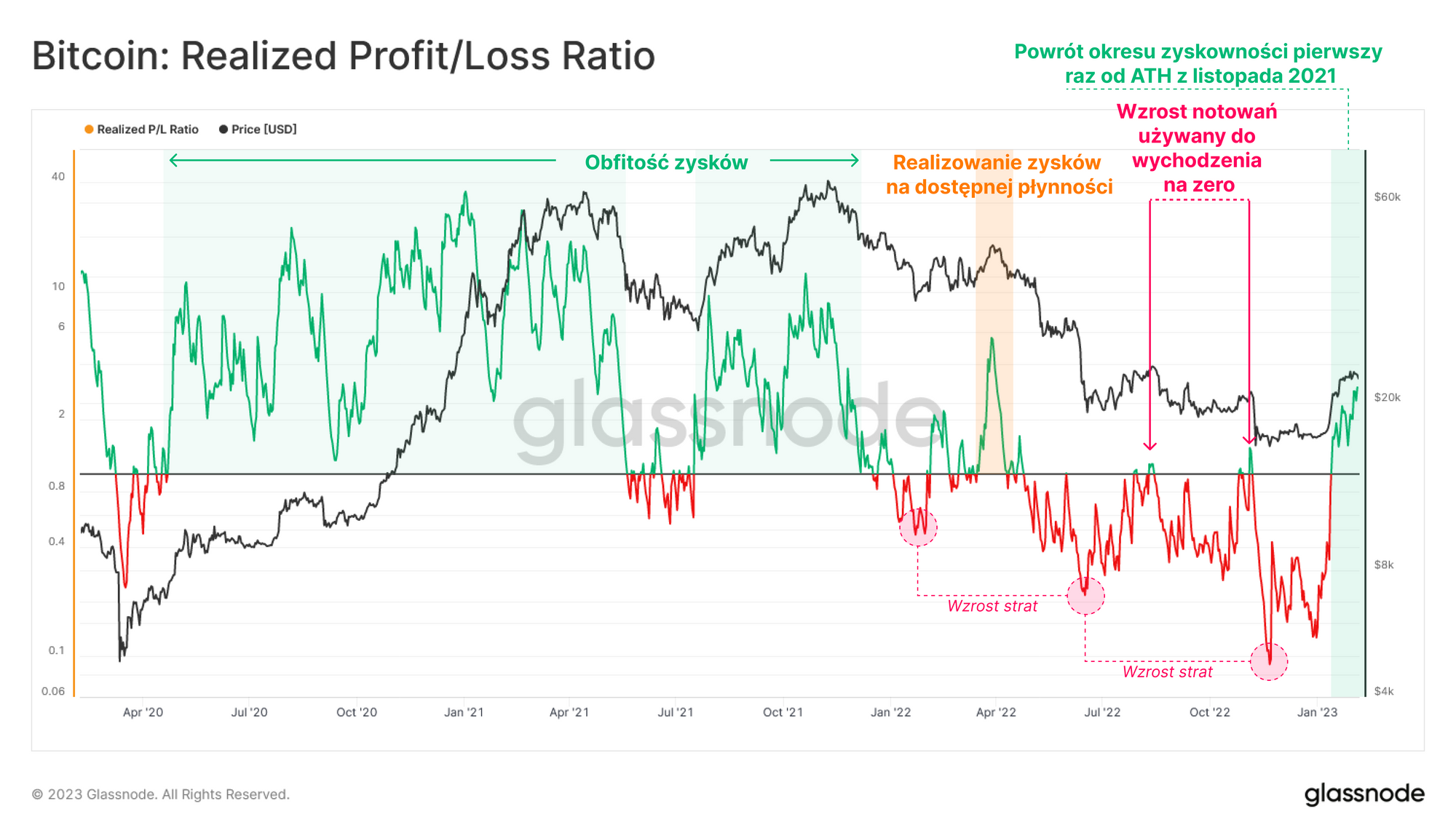 Biorąc pod uwagę stosunek między Zrealizowanymi Zyskami a Stratami, możemy zidentyfikować zmiany strukturalne w dominacji między nimi. Po załamaniu notowań po ATH z listopada 2021 roku nastąpił okres silnie zdominowany przez straty, który spowodował spadek wskaźnika Zrealizowanych Z/S poniżej 1, z rosnącą dotkliwością z każdą kolejną kapitulacją na rynku.