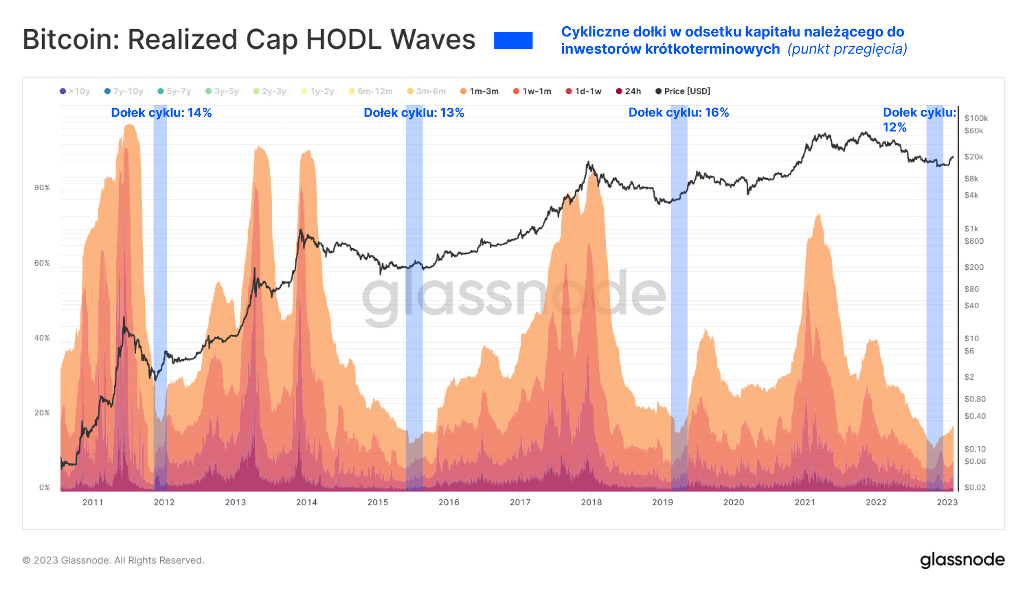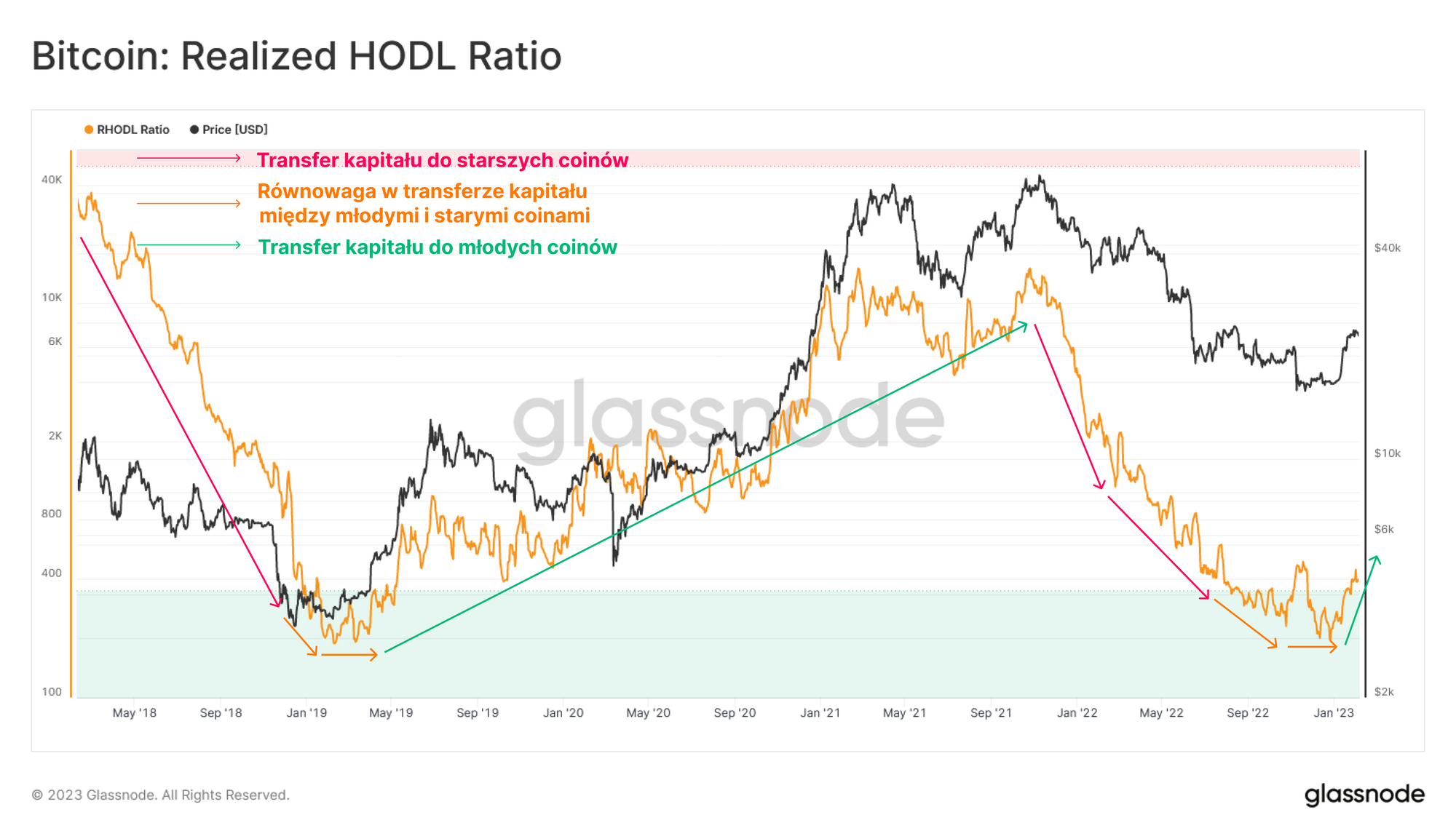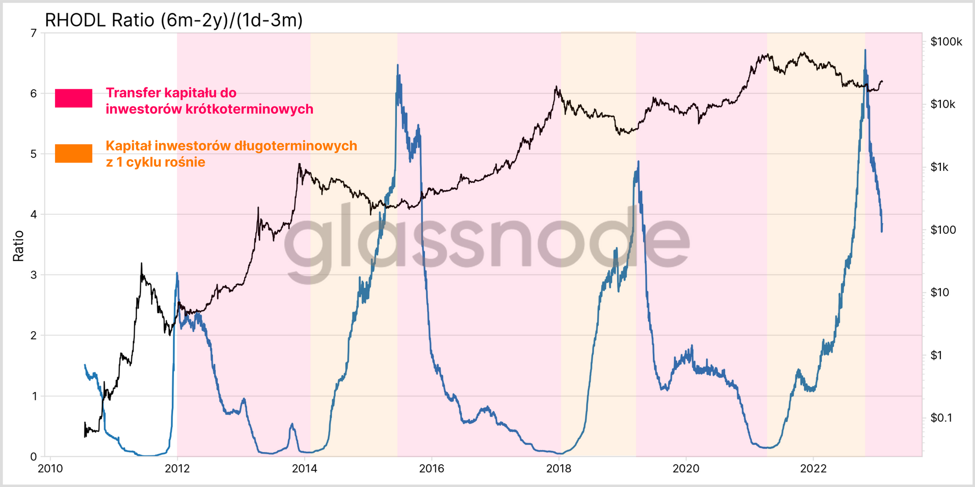 Mając to na uwadze, możemy wprowadzić nową odmianę wskaźnika RHODL, która porównuje kapitał posiadany przez długoterminowych inwestorów jednego cyklu (6msc -2 lata) z najmłodszymi inwestorami krótkoterminowymi (1 dzień -3 msc). Ma to na celu ocenę punktu zwrotnego rotacji kapitału w różnych cyklach przejściowych.