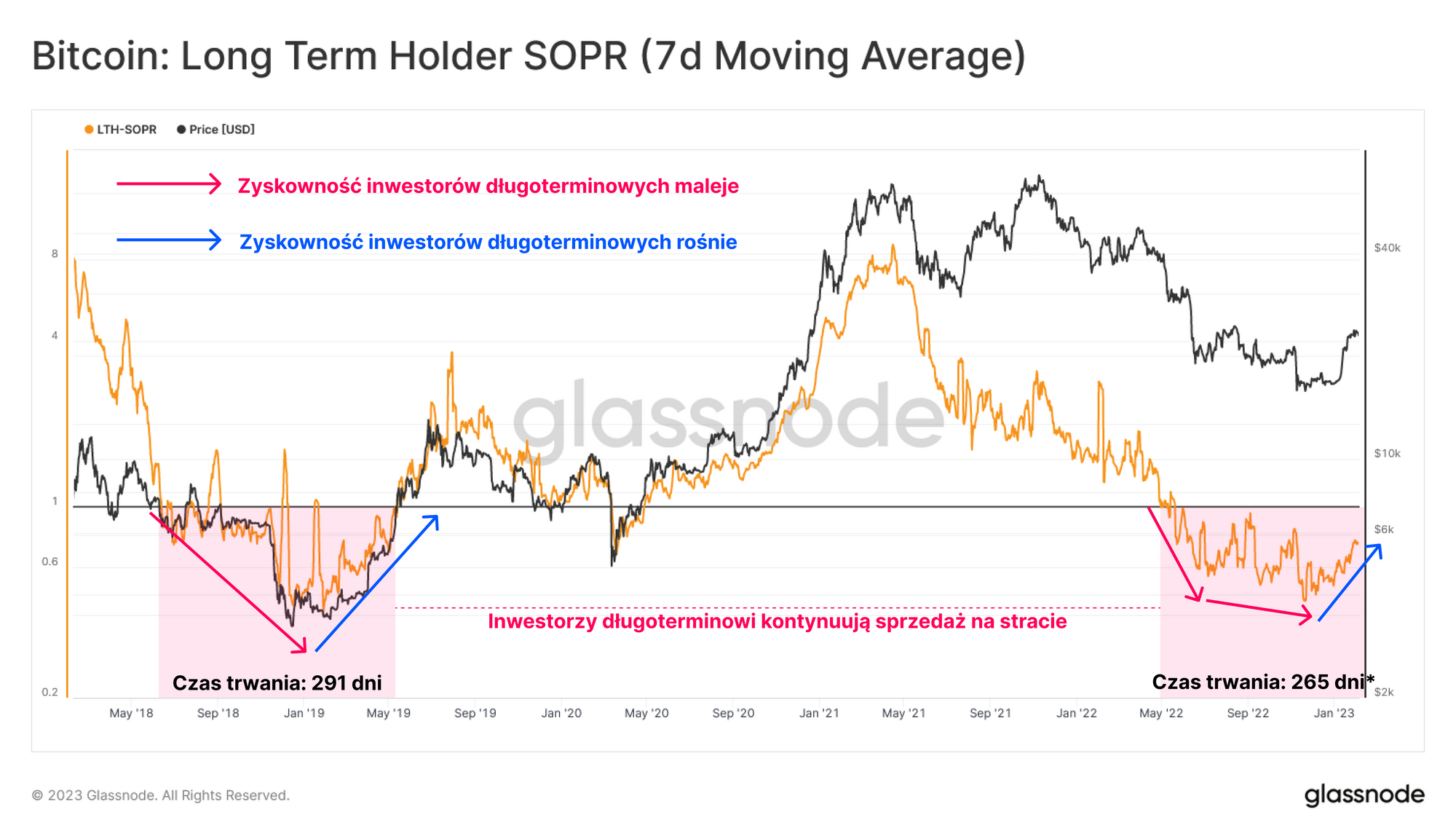 Oceniając grupę inwestorów długoterminowych, możemy zaobserwować utrzymujący się okres realizacji strat od czasu upadku LUNY. Pomimo tego, że ta grupa przez ostatnie 9 miesięy odnotowywała straty, pojawiają się pierwsze oznaki poprawy ich sytuacjiw postaci potencjalnego formowania się trendu wzrostowego LTH-SOPR.