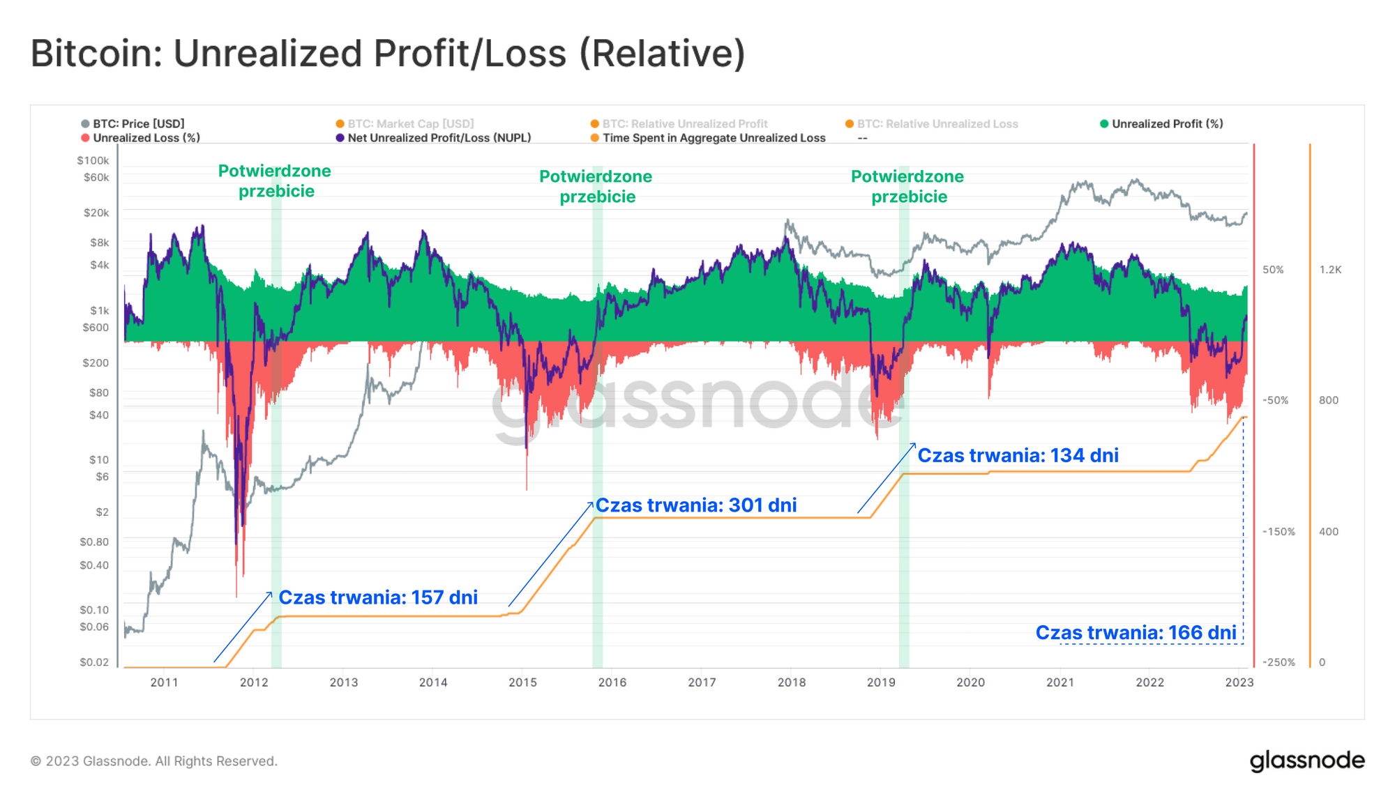 Porównując czas, gdy NUPL był ujemny we wszystkich poprzednich bessach, obserwujemy historyczne podobieństwo między naszym obecnym cyklem (166 dni) a bessami 2011-12 (157 dni) i 2018-19 (134 dni). Bessa z lat 2015-16 pozostaje wyjątkowa pod tym względem, gdyż okres niezrealizowanych strat trwał prawie dwa razy dłużej niż w kolejnej pod tym względem bessie (cykl 2022-23).