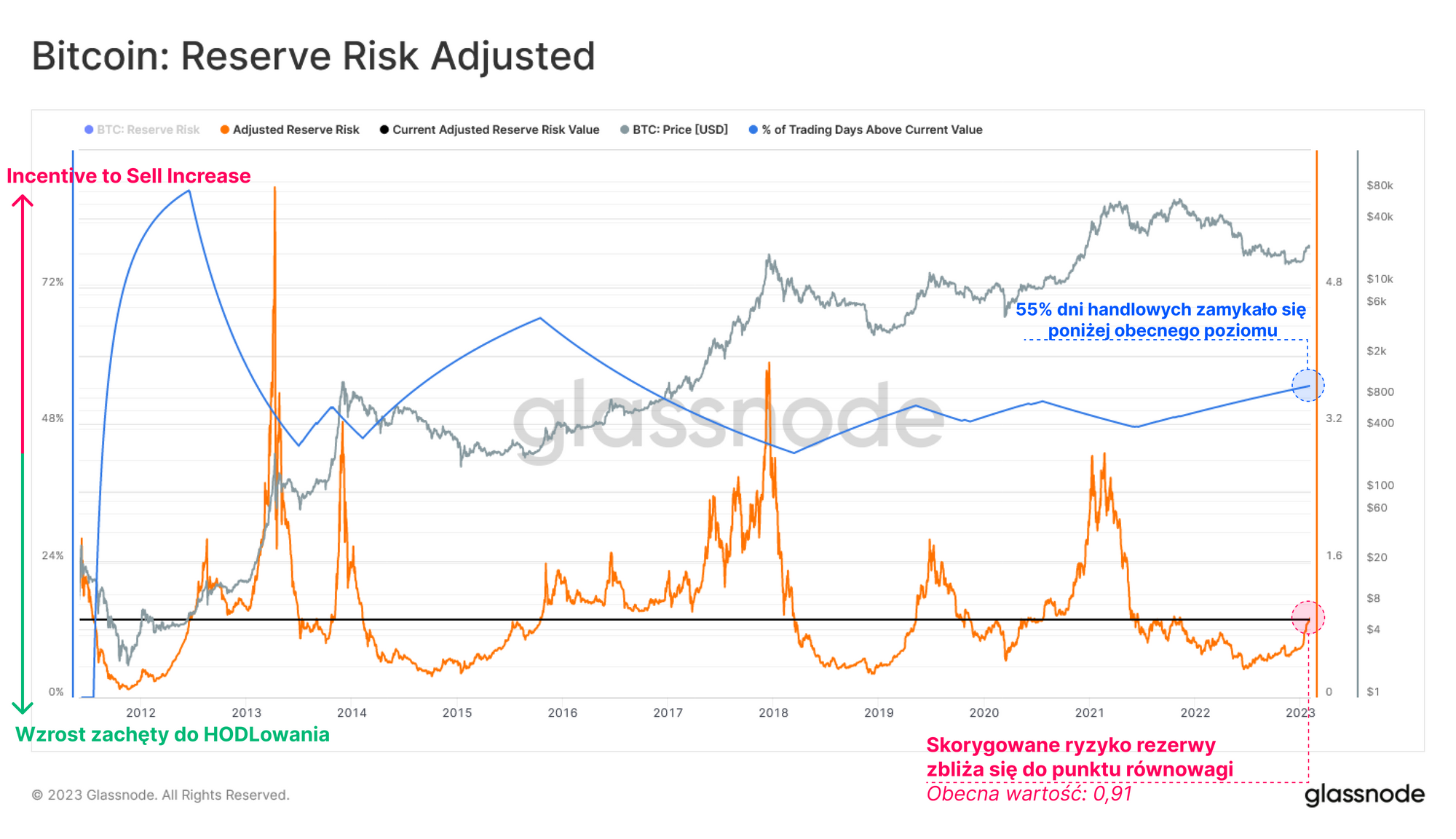 Wydaje się, że obecnie ma miejsce strukturalna zmiana tego trendu, ponieważ oscylator zbliża się do swojej pozycji równowagi (55% wszystkich dni sesyjnych poniżej bieżącej wartości). Sugeruje to, że koszt alternatywny HODLingu maleje, podczas gdy motywacja do sprzedaży rośnie.