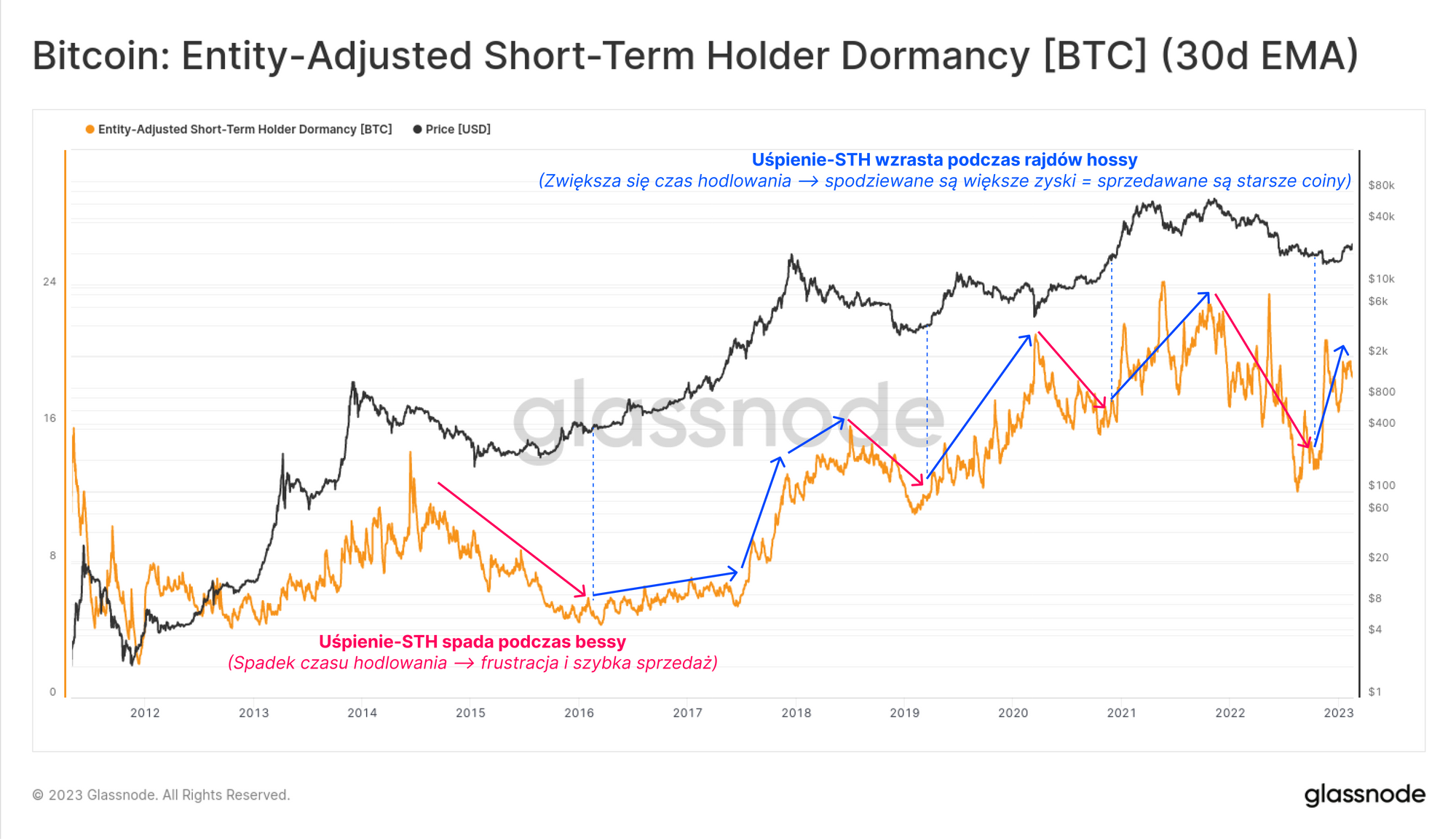 - Wyższe wartości wskazują, że STH sprzedają coiny o dłuższym okresie hodlowania. Jest to zwykle widoczne podczas impulsów wzrostowych, ponieważ oczekiwania zysków zachęcają inwestorów do hodlowania nieco dłużej i podążania za wahaniami rynku.