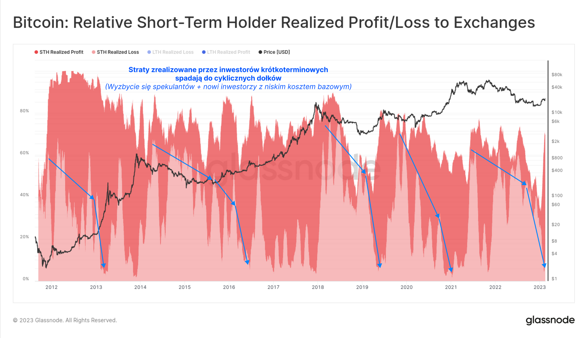Poniższy wykres pokazuje względny udział zysków i strat zrealizowanych przez grupę STH, wyseparowanych specjalnie pod kątem coinów wysyłanych na giełdy, aby jak najlepiej oddać siły po stronie sprzedaży. Widzimy schemat zanikania względnych strat STH w miarę zbliżania się do dołków cyklu rynkowego, gdy spekulanci są wyrzucani z rynku, a coiny są przekazywane nabywcom utwierdzającym dno, z niższymi kosztami bazowymi.