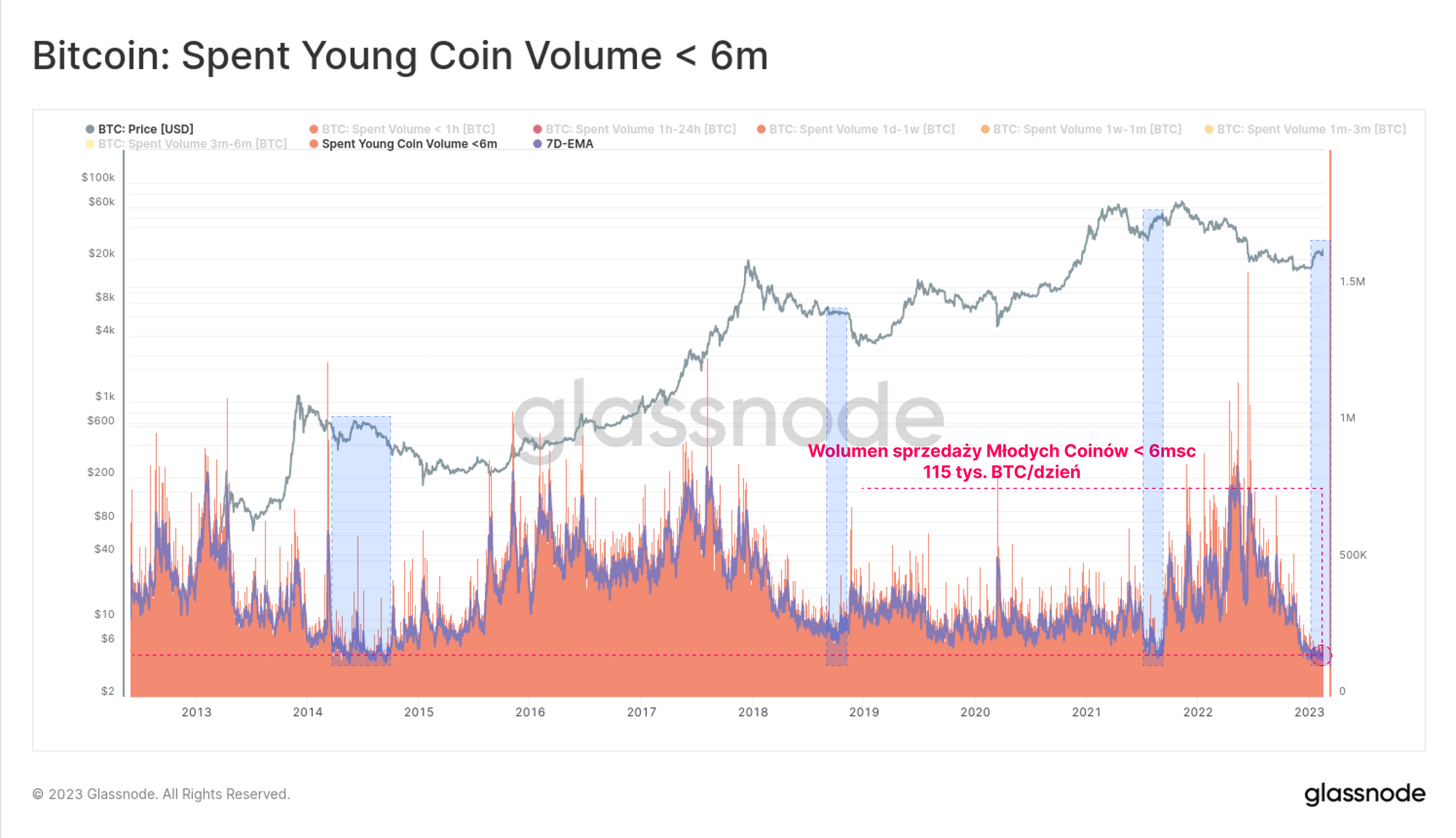Co ciekawe, pomimo wzrostu notowań, wolumen transferowanego kapitału pozostaje bardzo niski. Poniższy wykres pokazuje, że mniej niż 115 000 BTC dziennie w całkowitym transferowanym wolumenie (w tym sprzedaże tego samego coina) można przypisać do coinów młodszych niż 6 miesięcy. Tak niskie wartości obserwowano tylko kilka razy w historii.