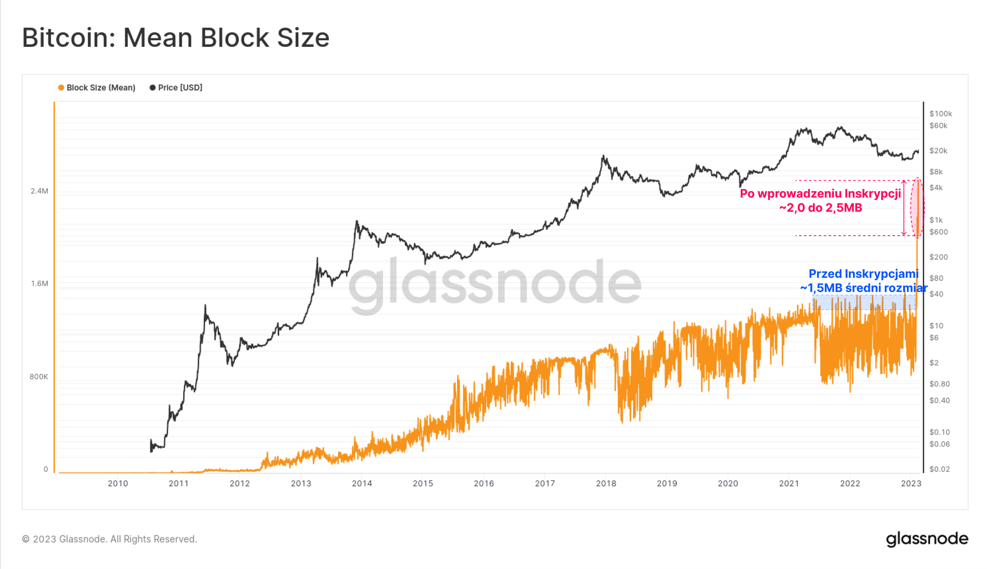 Początkowa fala Inskrypcji na Bitcoinie przekroczyła w sumie 100 000 plików trwale przechowywanych na blockchainie Bitcoina, kreując zupełnie nowe i nieoczekiwane źródło popytu na przestrzeń blokową. Inskrypcje są wyjątkowe, ponieważ nie wymagają transferu dużych ilości BTC, pomimo ich wartości dla wymagających właścicieli i nabywców.