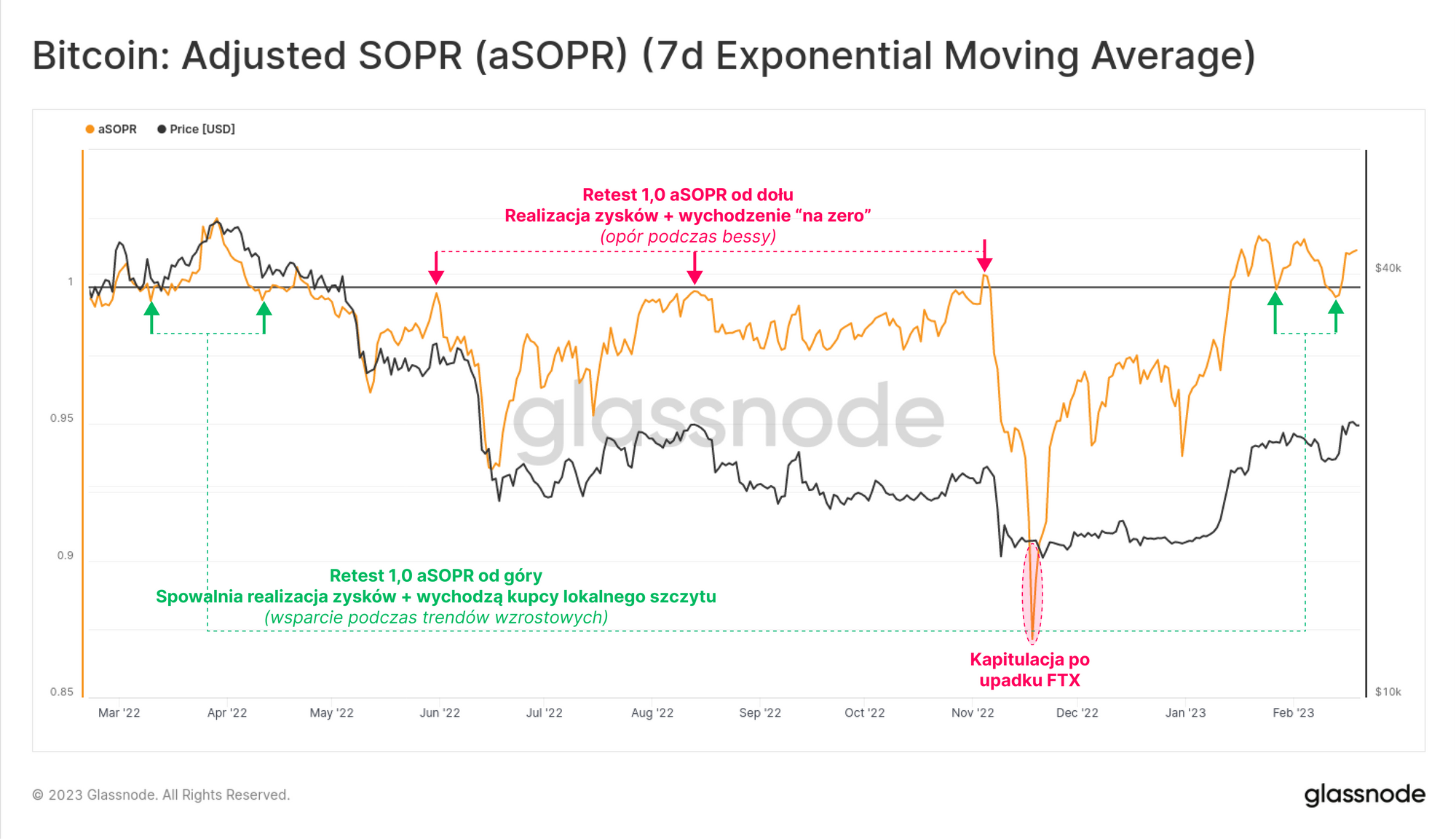 Zachowanie nastawione na zysk możemy zaobserwować w kilku wariantach SOPR, które znajdują wsparcie na neutralnej wartości 1,0. Retest poziomu 1,0 na wykresie aSOPR podczas impulsu wzrostowego wskazuje, że realizacja zysków spowalnia (co w przeciwnym razie oznaczałoby presję zwyżkową na metrykę), a posiadacze coinów na stracie również spowalniają w swoich sprzedażach.