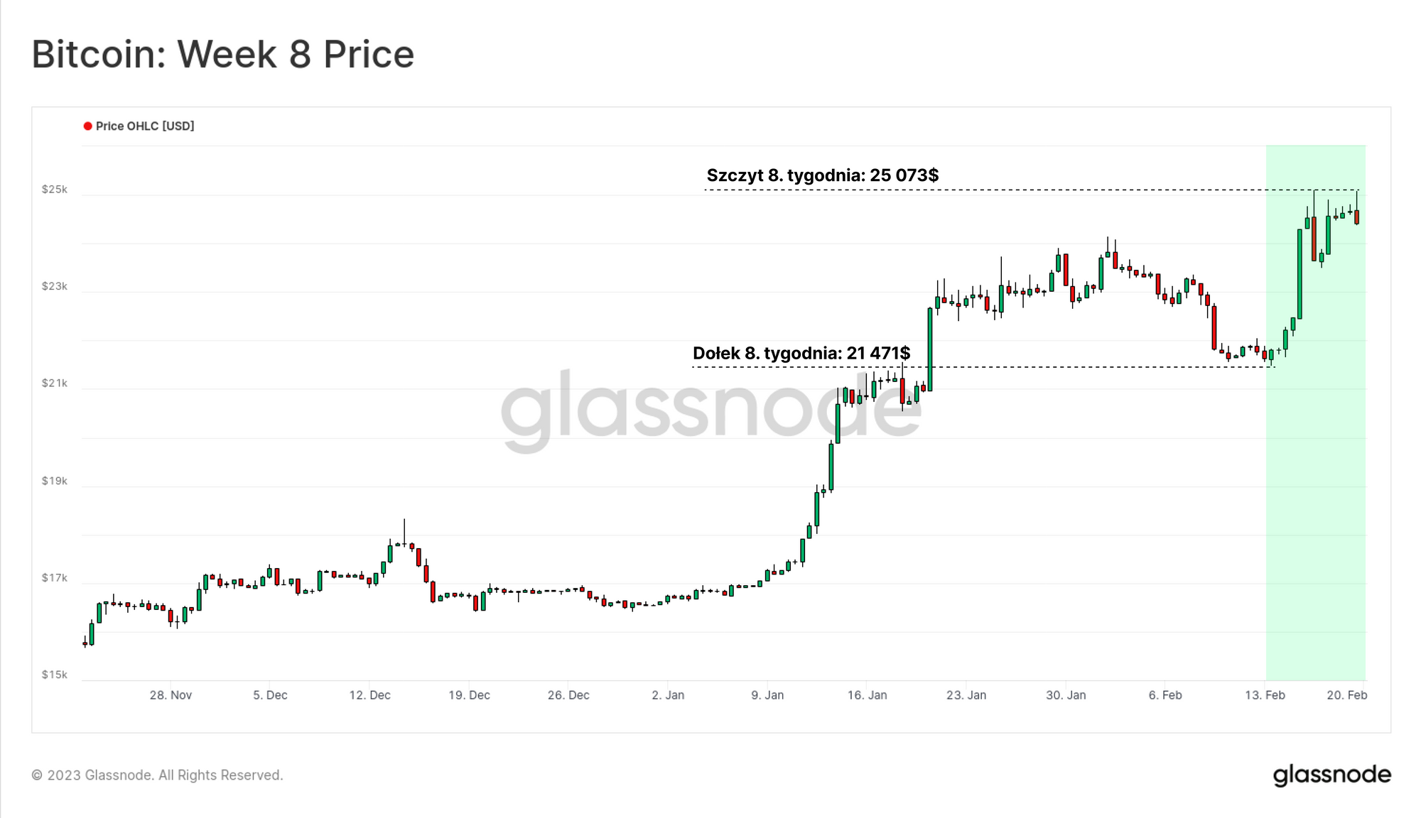 Bitcoin odnotował kolejny silny tydzień, odrabiając całą korektę zeszłego tygodnia i osiągając ponad 25 000$ - najwyższe notowania od czerwca 2022 r. Ta rynkowa siła ma miejsce pomimo ciągłej presji ze strony amerykańskiego środowiska regulacyjnego do spraw aktyw cyfrowych.