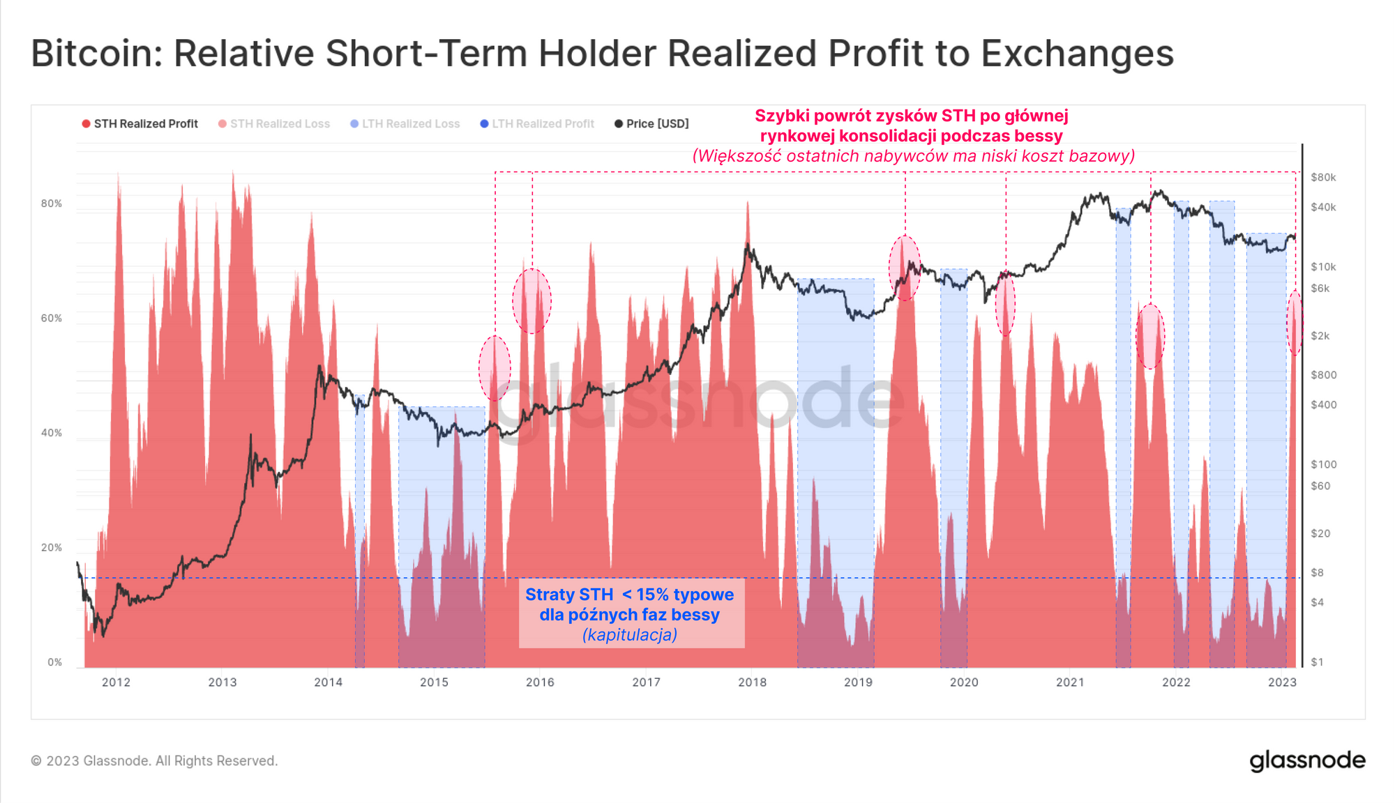 Gdy rynek wychodzi z przedłużającej się bessy 🟦, nowi nabywcy STH z entuzjazmem czerpią zyski, gdy notowania wzrastają znacznie powyżej typowego wielomiesięcznego zakresu formowania dna. Grupa STH jest więc wtedy prawie całkowicie na plusie, co powoduje, że większość coinów sprzedawanych przez STH jest zyskowna 🔴.