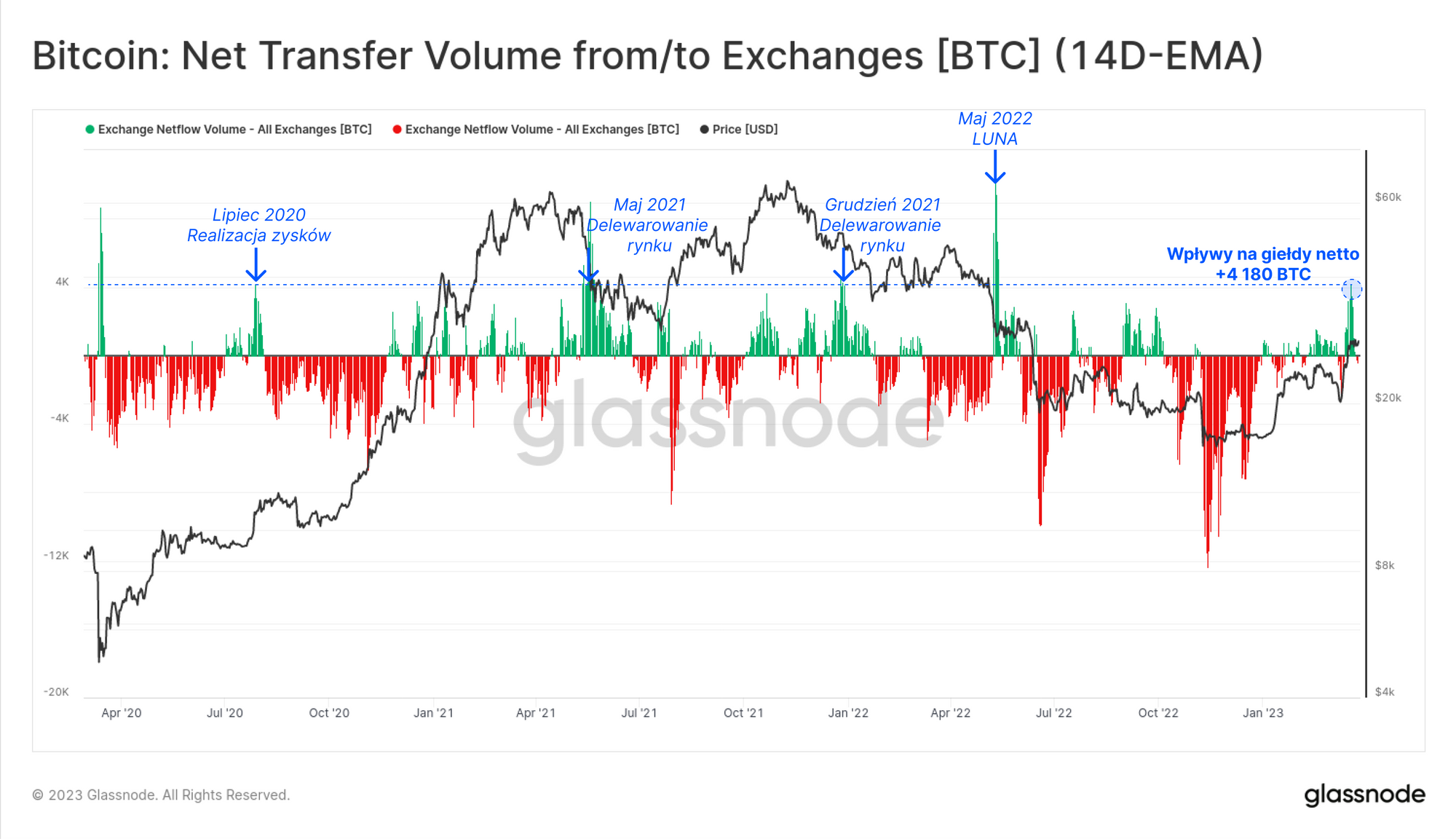 W odpowiedzi na silny wzrost notowań w ostatnich tygodniach, inwestorzy zwiększyli wolumen coinów deponowanych na giełdy. W ubiegłym tygodniu przepływy na giełdy netto wzrosły o około 4,18 tys. BTC, co stanowi największy wzrost netto od czasu upadku LUNY w maju 2022 roku.
