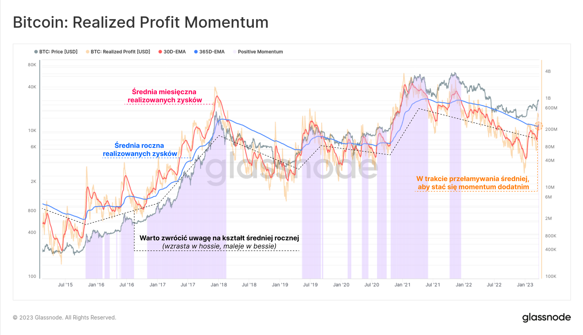 Mierzenie zrealizowanego zysku/straty jest potężną techniką analizy on-chain, umożliwioną dzięki Pricestampowaniu coinów podczas ich przemieszczania po sieci. Dzięki temu możemy porównać wielkość zysków odnotowanych w ciągu ostatniego miesiąca ze średnią roczną. Widzimy tu pierwsze dodatnie przecięcie momentum od ATH z października-listopada 2021 roku.