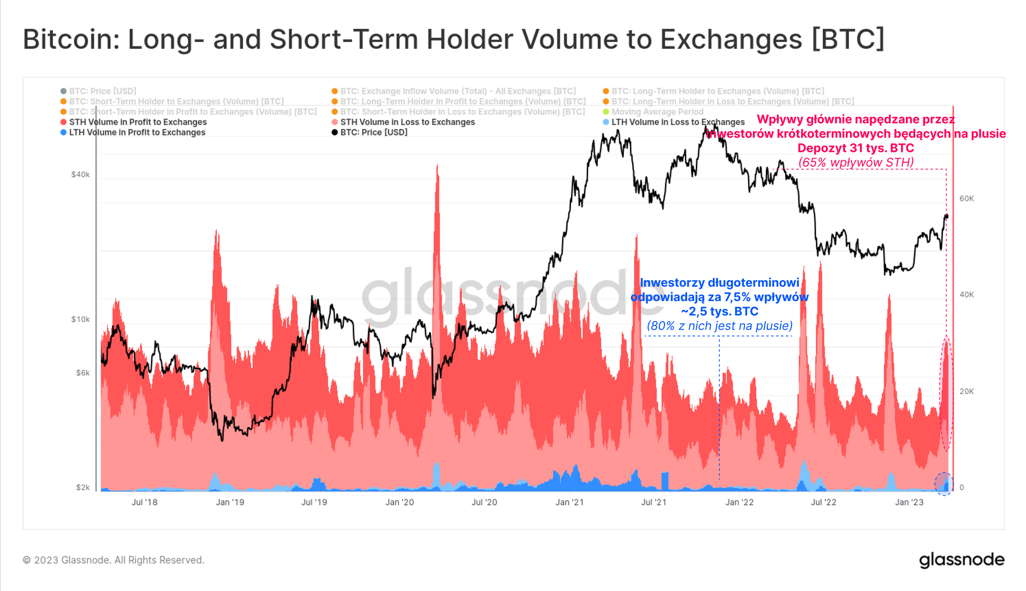 - Inwestorzy krótkoterminowi dominują w łącznym wolumenie wpływów, odpowiedzialni są za 92,5% wolumenu, z czego 65% stanowią coiny STH z zyskiem,