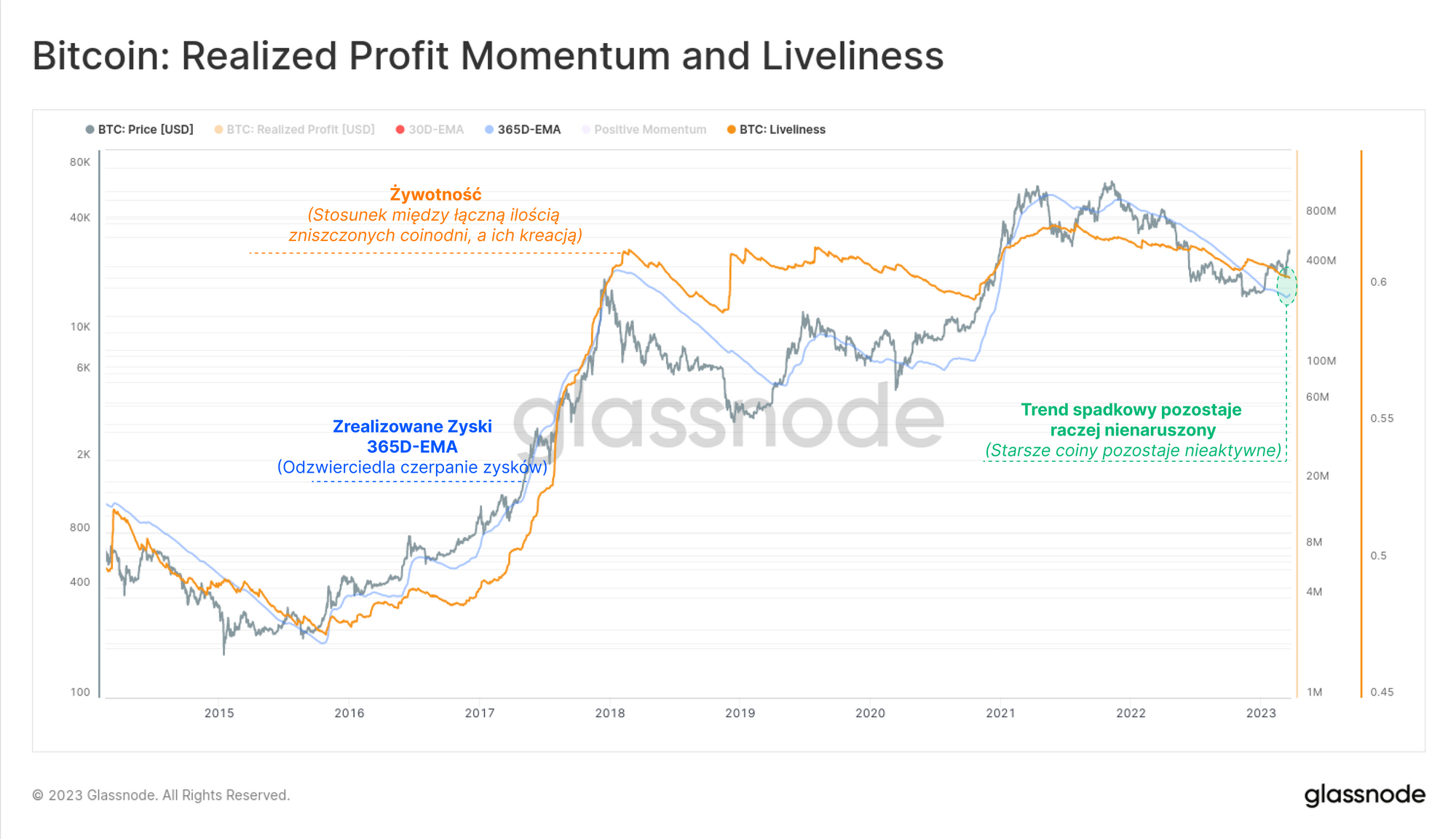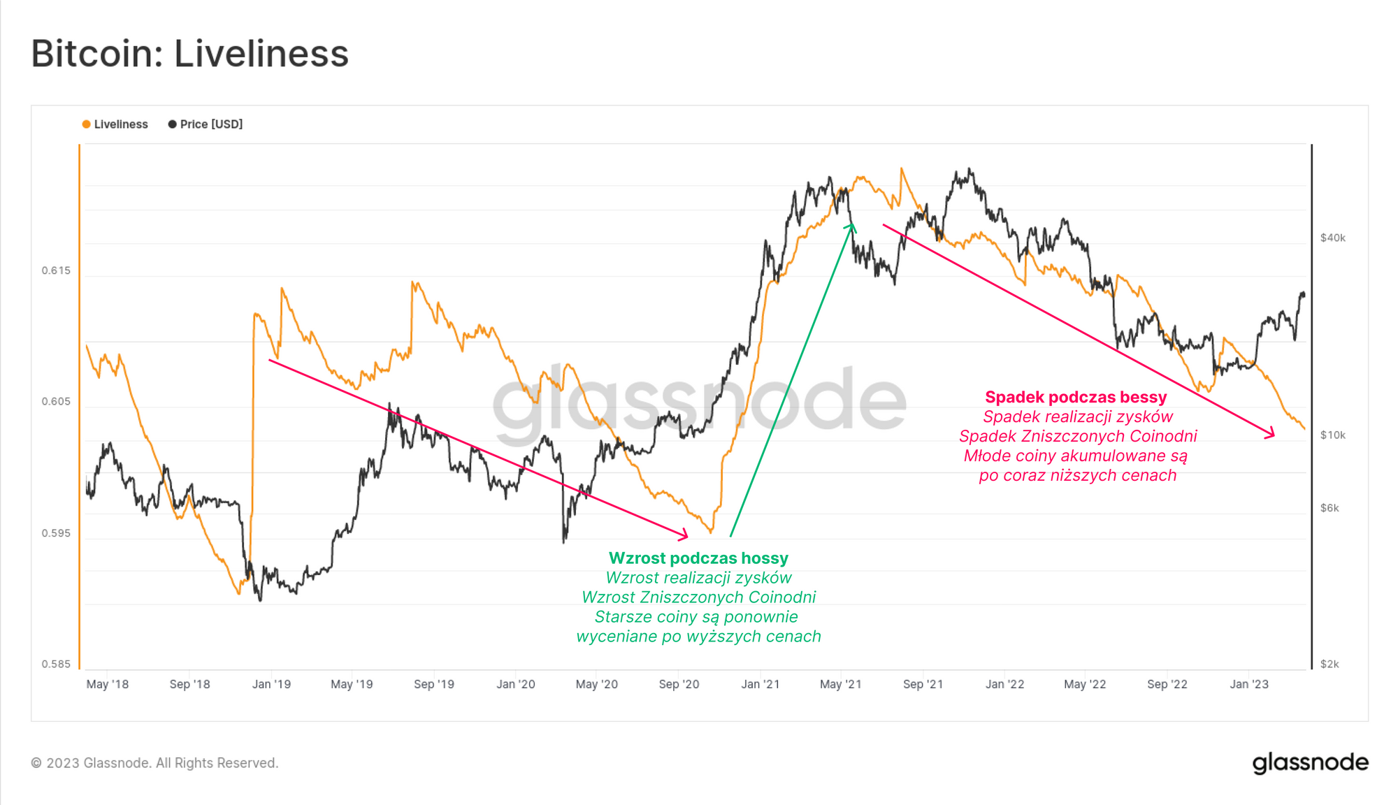 - Żywotność będzie rosnąć, gdy rynek będzie preferował dystrybucję starych monet oraz następował będzie drenaż „rezerwuaru czasu życia” coinów, co sugeruje, że aktywo jest uważane za drogie.
