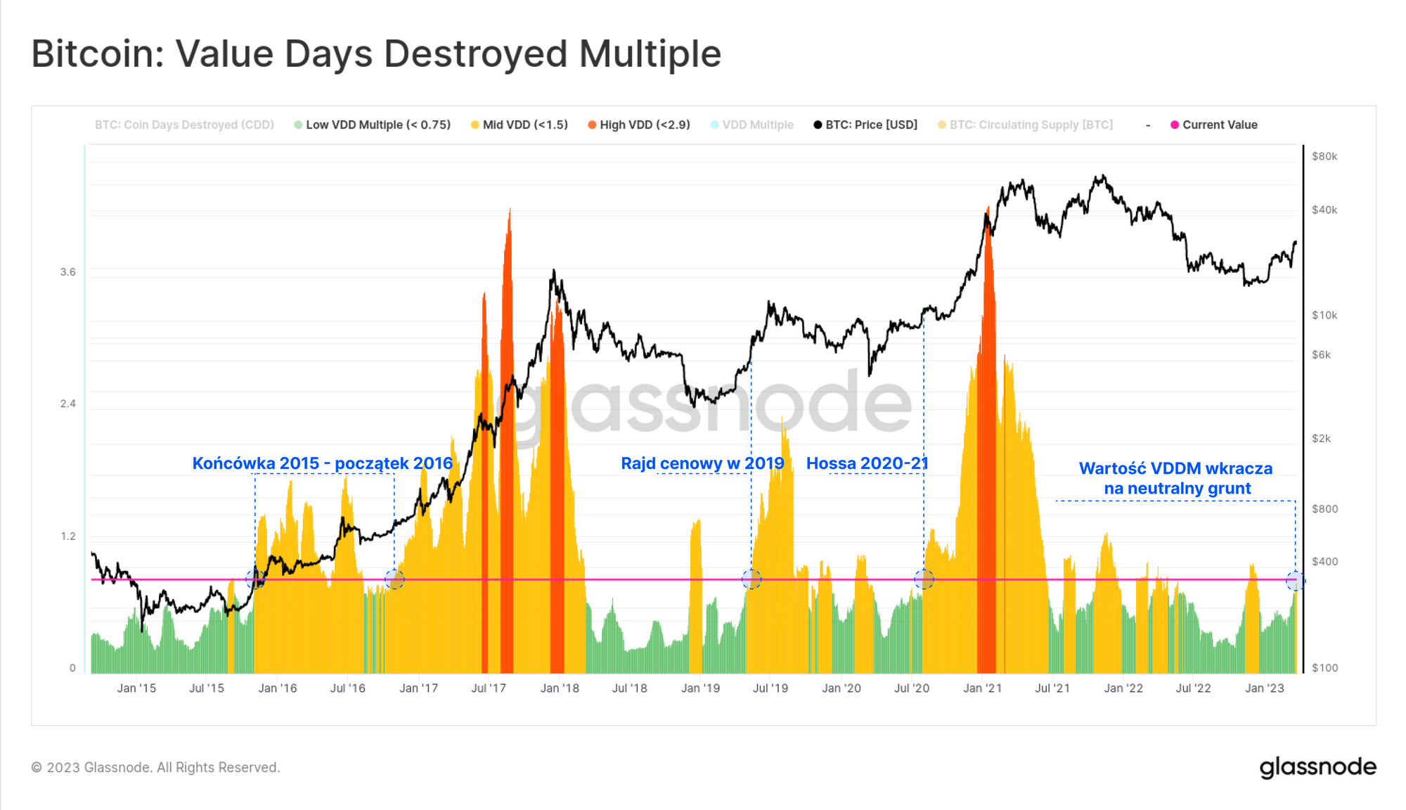 Ostatnią z analizowanych miar związanych z czasem życia (Lifespan) można odnieść do ceny aktywa. Zrobimy to na podstawie naszych wcześniejszych badań, w których stworzyliśmy wskaźnik Value Days Destroyed Multiple (VDDM). Wskaźnik ten porównuje miesięczną wartość w dolarach Zniszczonych Coinodni (CDD) z jej średnią roczną.