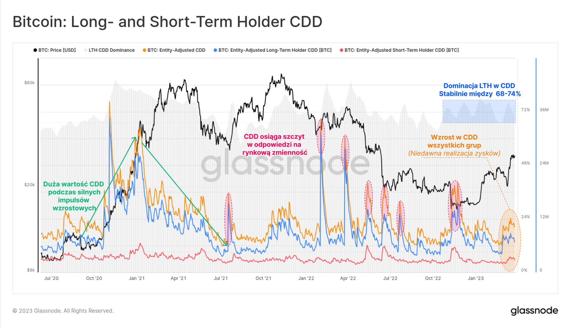 Niedawny wzrost CDD jest dość widoczny, gdy zostanie podzielony na grupy LTH (inwestorzy długoterminowi) i STH (inwestorzy krótkoterminowi). Pomimo że inwestorzy długoterminowi przyczyniają się najmniej do wolumenu sprzedawanych monet, ich czas posiadania jest znacznie dłuższy, dlatego mają tendencję do wpływania w większym stopniu na wskaźnik „czasu życia” coina.