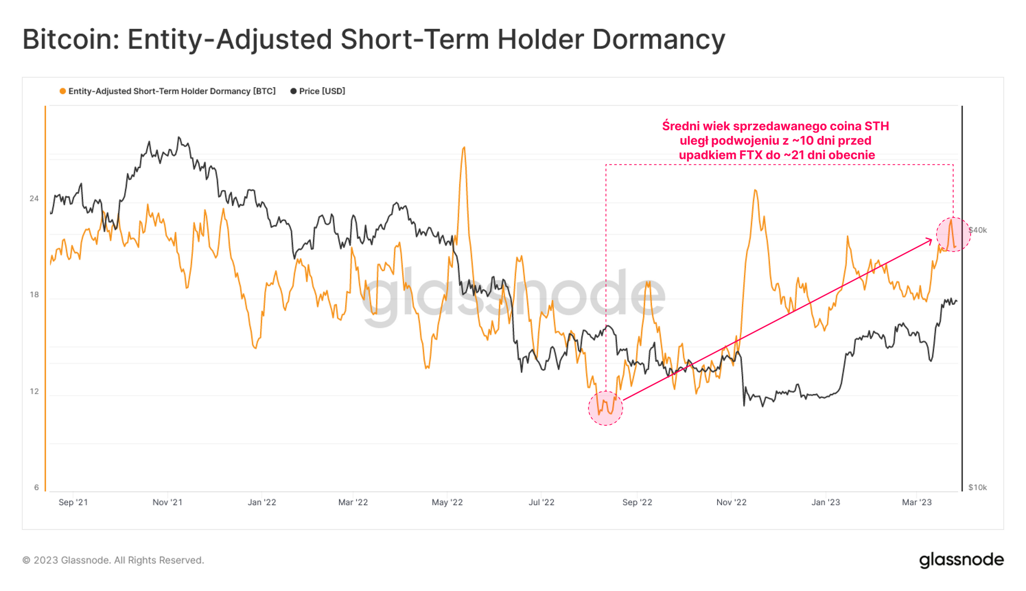Przyglądając się bliżej inwestorom krótkoterminowym, średni wiek coina sprzedanego przez STH również wzrósł, zwiększając się praktycznie dwukrotnie z około 10 dni w miesiącach poprzedzających upadek FTX do 21 dni obecnie. To dodatkowo potwierdza argument, że to grupa inwestorów krótkoterminowych, którzy gromadzili BTC w pobliżu dołków cyklu, jest głównym uczestnikiem ostatniej realizacji zysków.
