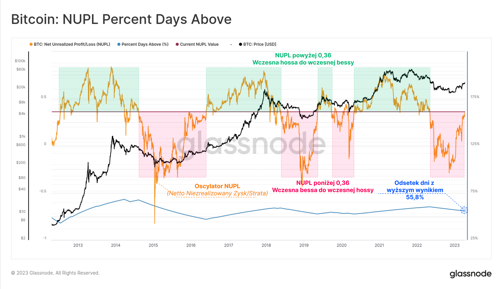 Powrót tak wielu coinów do niezrealizowanego zysku powoduje, że pokusa do sprzedaży zaczyna rosnąć. Popularny wskaźnik NUPL dostarcza miary, ile z kapitalizacji rynkowej Bitcoina jest trzymane w postaci niezrealizowanego zysku.