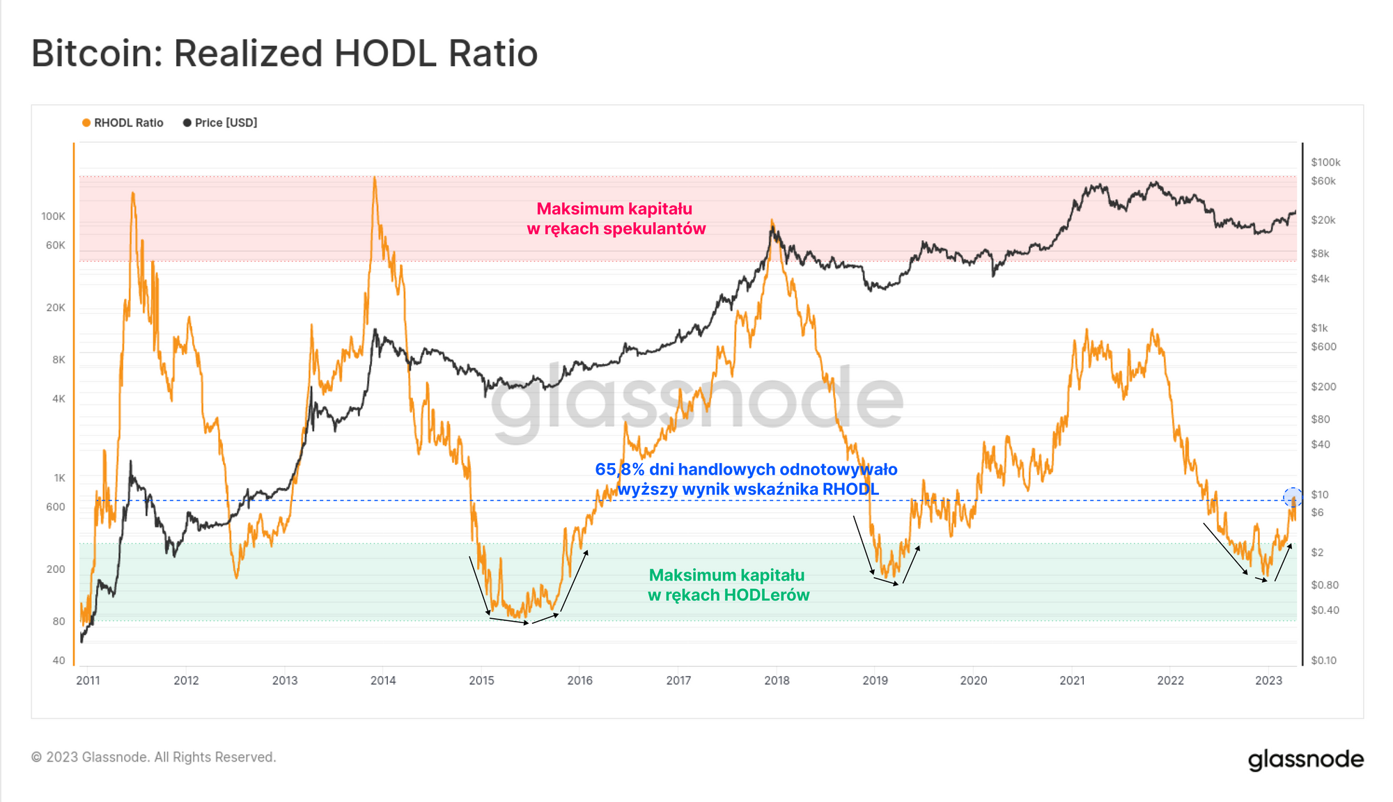 Obie powyższe obserwacje można zobrazować za pomocą wskaźnika RHODL, który jest w trakcie zawracania się z punktu maksymalnego nasycenia HODLerów. Według tego wskaźnika cykl prawdopodobnie przeszedł na korzyść byków, ale nie jest już także w strefie niedowartościowania (ani przewartościowania z historycznego punktu widzenia).
