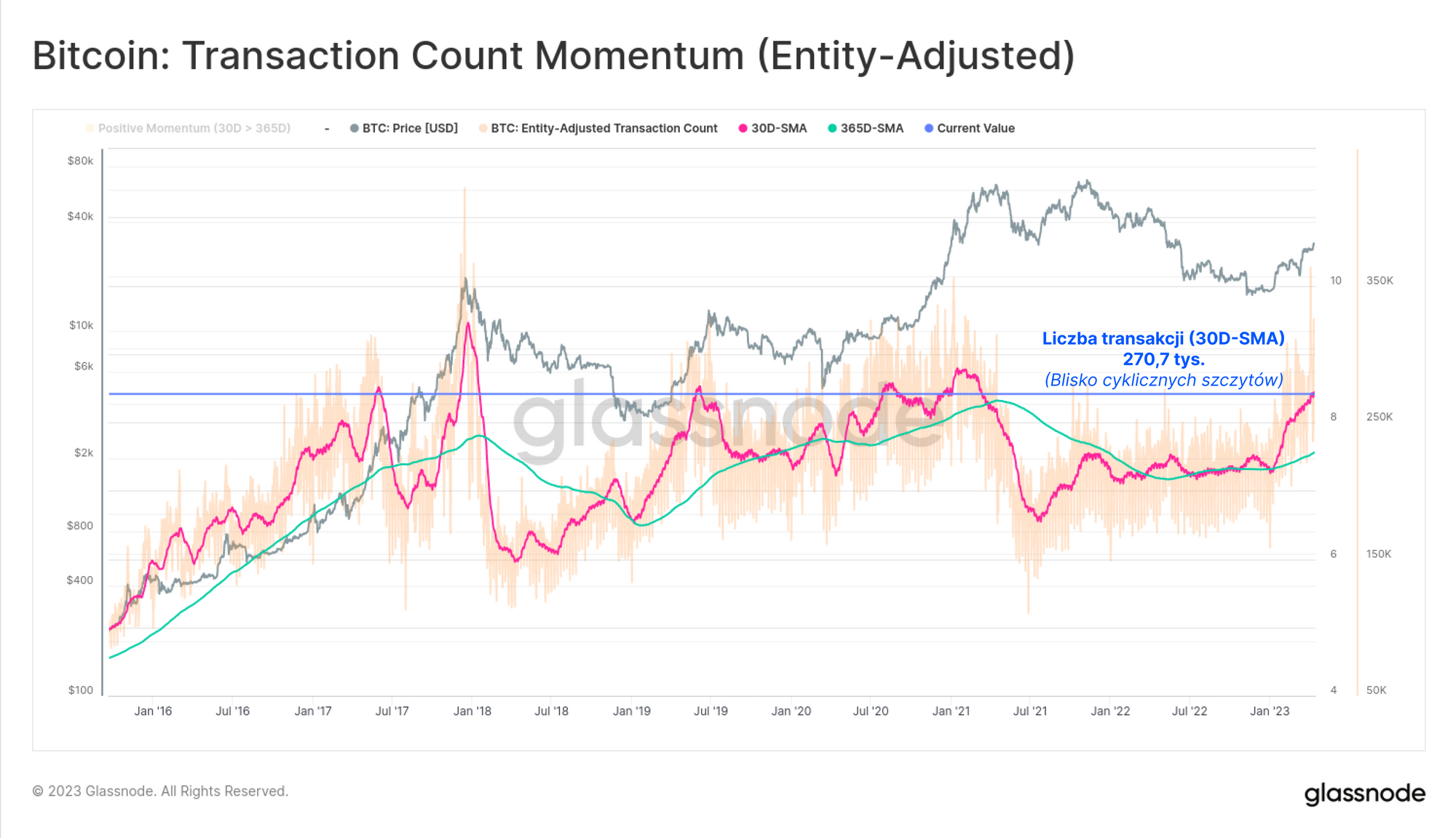 Podczas gdy HODLerzy są często kojarzeni z uśpionymi coinami, sieć Bitcoina nadal jest bardzo aktywna. Liczba organicznych transakcji przekracza obecnie poziom 270 tys. dziennie, co zbliża się do szczytów cyklu, jeśli weźmiemy pod uwagę średnią miesięczną.