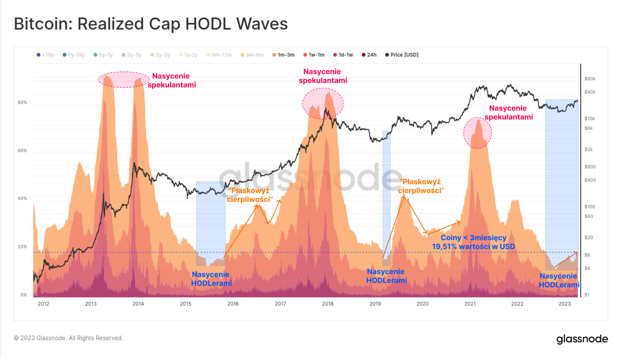 Dla kontrastu, oznacza to, że coiny starsze niż 3 miesiące (HODLerzy) posiadają ponad 80% kapitału, pomimo brutalnych spadków w 2022 roku i wzrostu notowań w 2023 roku.