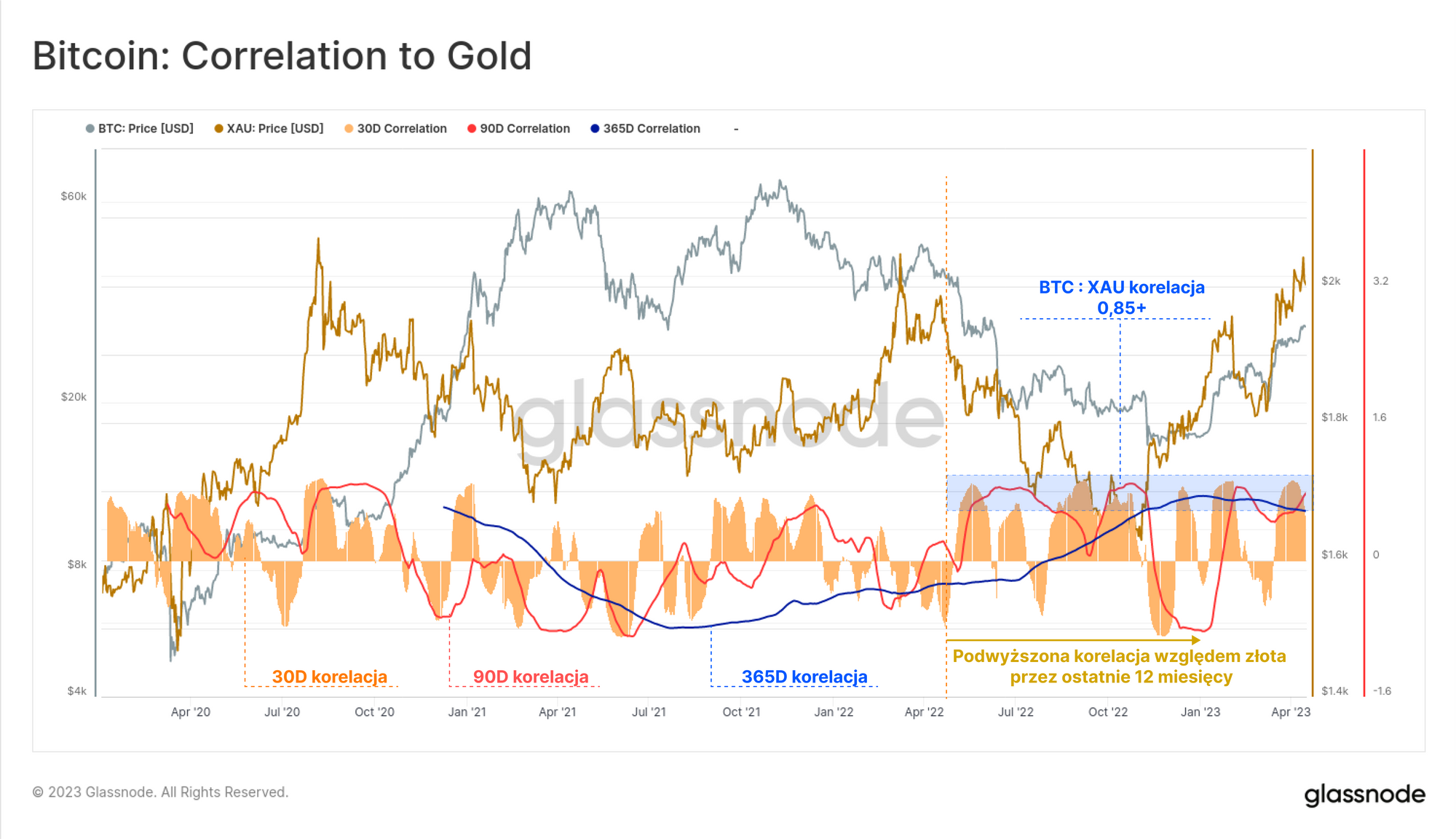 Ciekawym zjawiskiem, które miało miejsce w ciągu ostatnich 12 miesięcy, jest zwiększona korelacja między notowaniami BTC, a cenami złota, tradycyjnie bezpiecznego portu dla kapitału. Na podstawie 30-dniowego, 90-dniowego i 365-dniowego okresu korelacja między tymi dwoma aktywami jest teraz silnie dodatnia i utrzymywała się na wysokim poziomie nawet podczas niedawnego kryzysu bankowego w USA.