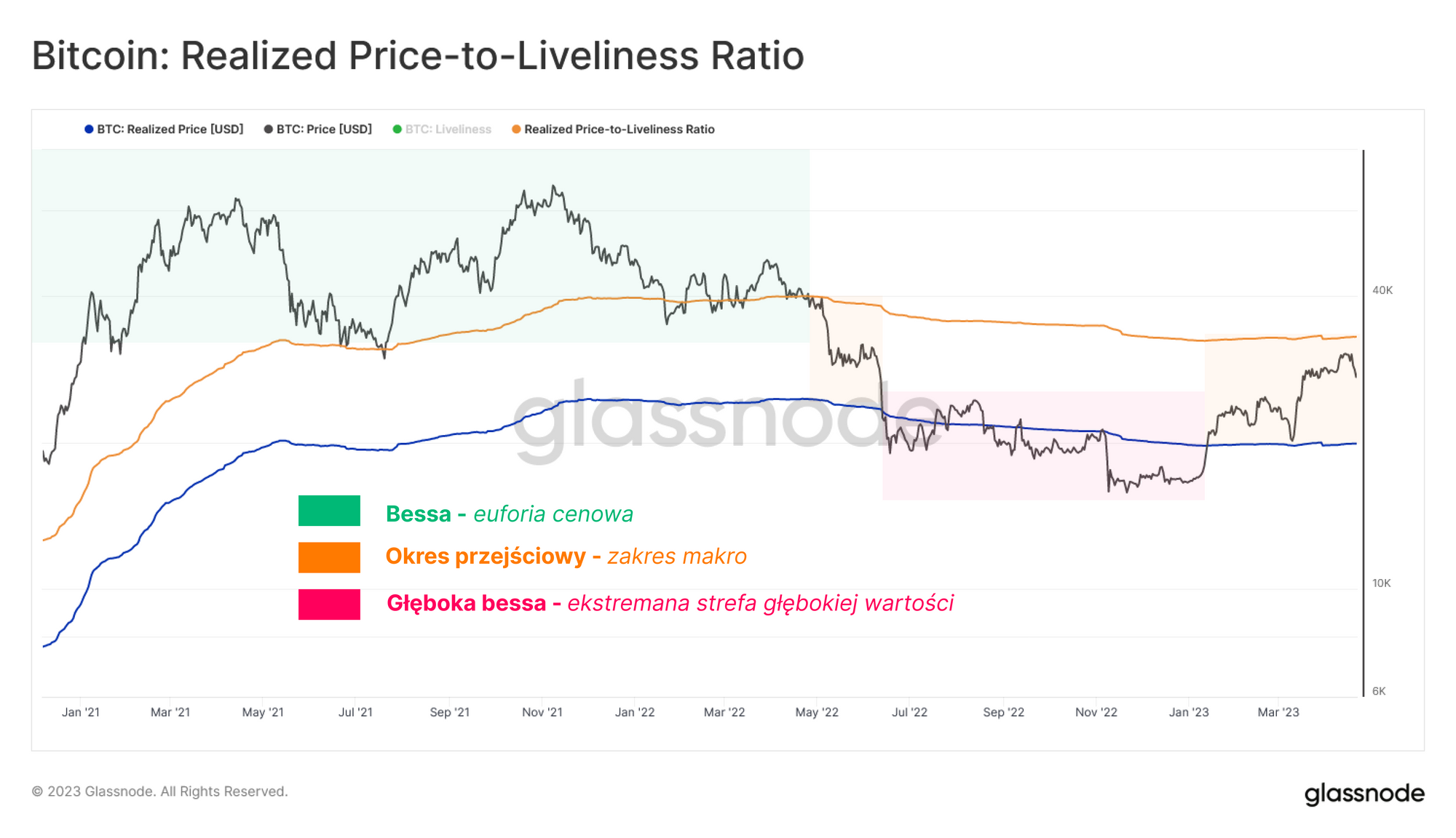 Obecnie cena spot Bitcoina znajduje się między dwoma popularnymi modelami wyceny On-chain: poziomem Realized Price 19 900$ reprezentującym średnią cenę nabycia podaży oraz stosunkiem Realized-do-Żywotności na poziomie 33 000$.