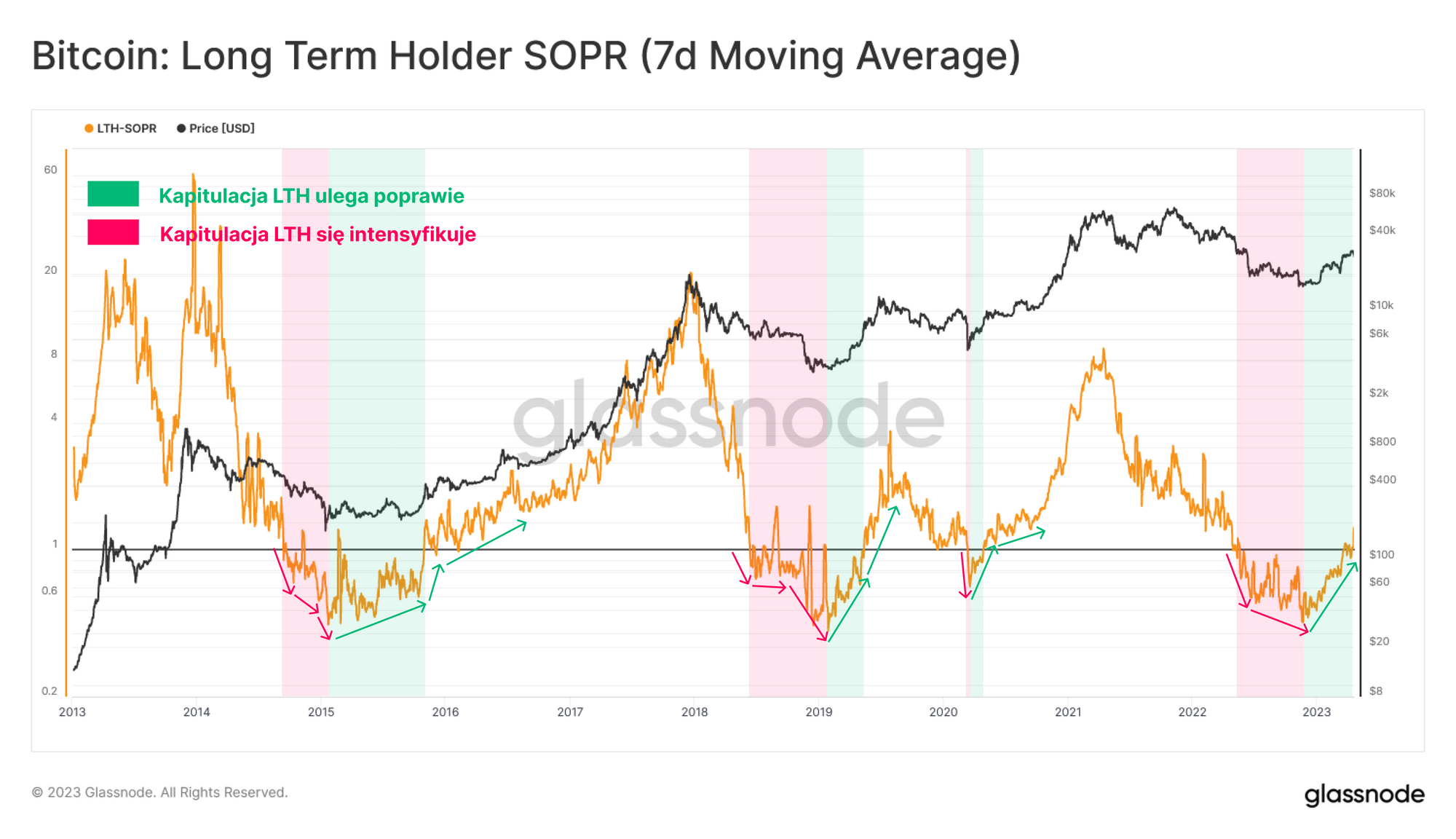 Wariant Long-Term Holder SOPR lepiej odzwierciedla makrozmiany rynkowe. Po długim okresie realizacji strat (LTH-SOPR <1,0), grupa LTH powraca w końcu do okresu zyskownych sprzedaży, co ponownie przypomina strukturę z poprzednich punktów przejściowych cyklu.