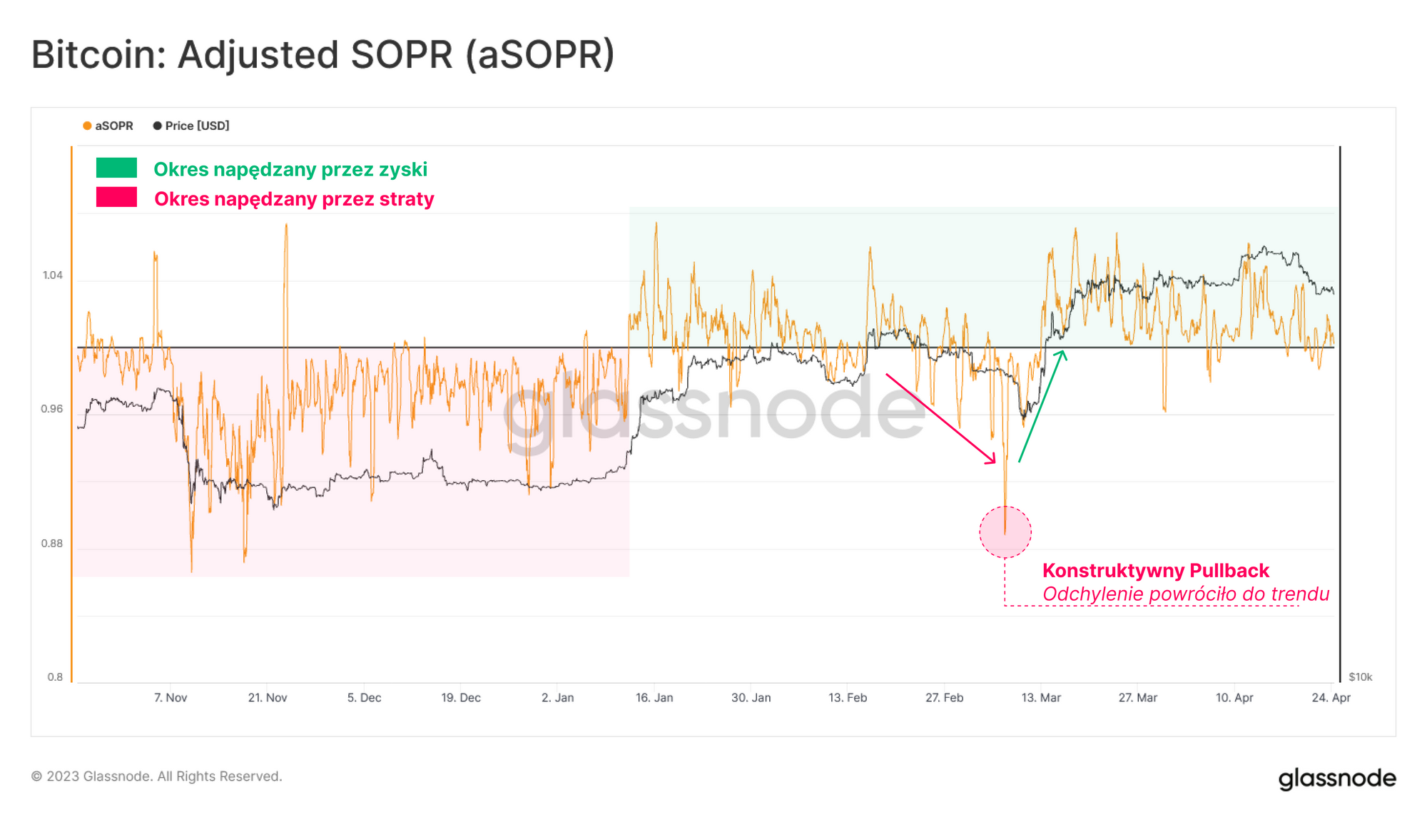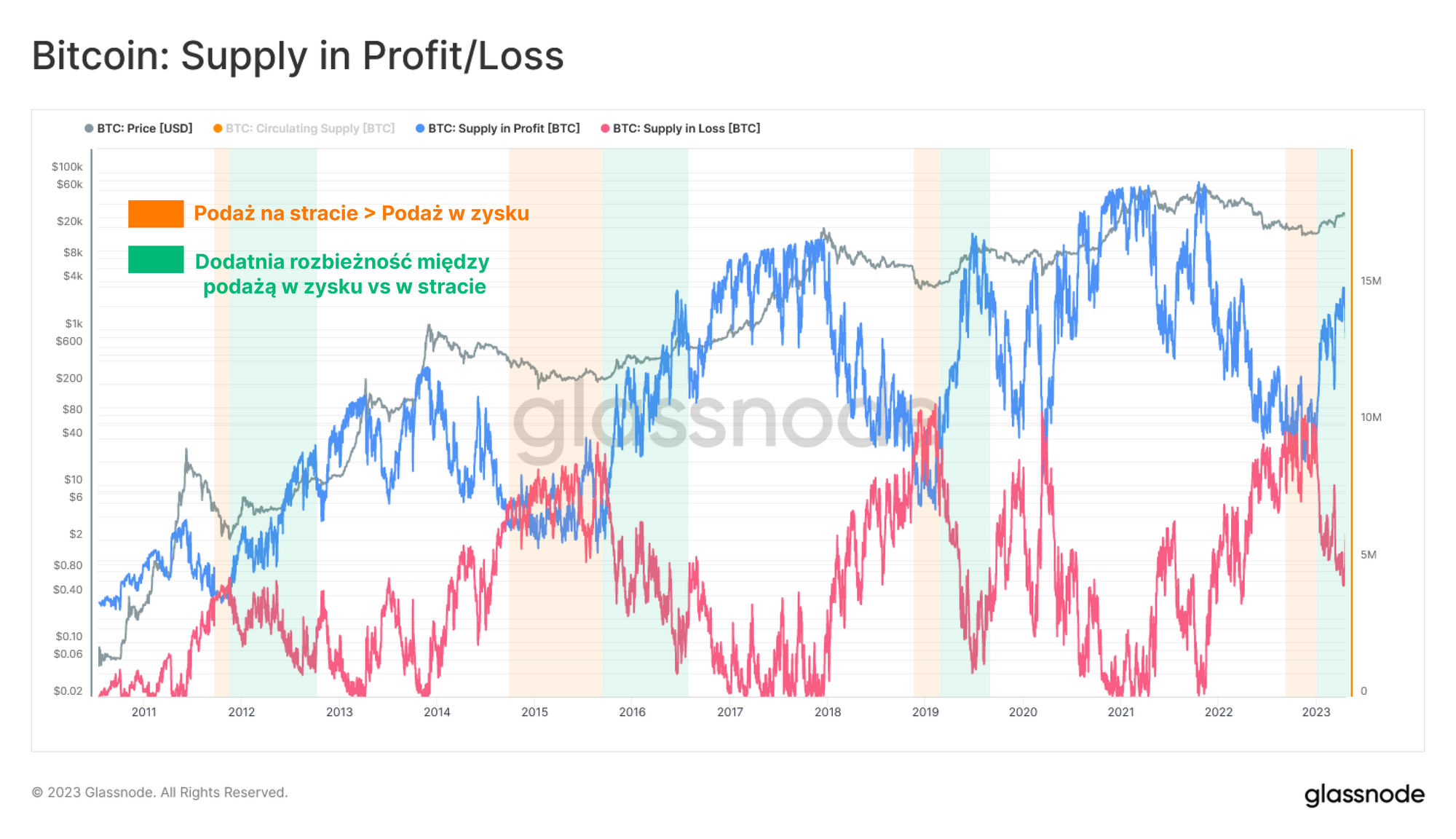 Wraz z silnym początkiem 2023 roku, rynek pewnie przeszedł z okresu niezrealizowanych strat do okresu niezrealizowanych zysków, co pokazuje ostre rozbieżności między podażą utrzymywaną w zysku a podażą utrzymywaną w stratach. W miarę jak to się dzieje, rośnie pokusa do realizacji zysków.