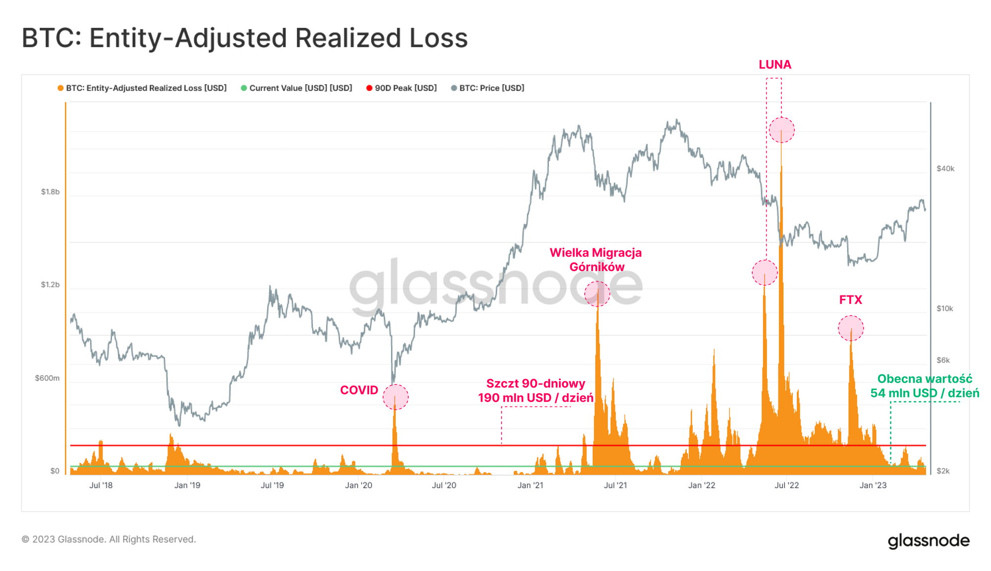 Ten sentyment zostawia ślad również w obszarze zrealizowanych strat, które nadal maleją. Całkowite straty pozostają stosunkowo niskie w porównaniu do wszystkich głównych wyprzedaży w 2021-2022. Wskazuje to na to, że w skali makro został osiągnięty pewien stopień wyczerpania sprzedaży, przynajmniej patrząc z punktu widzenia inwestorów posiadających duże straty (tj. kupujących na szczycie cyklu).